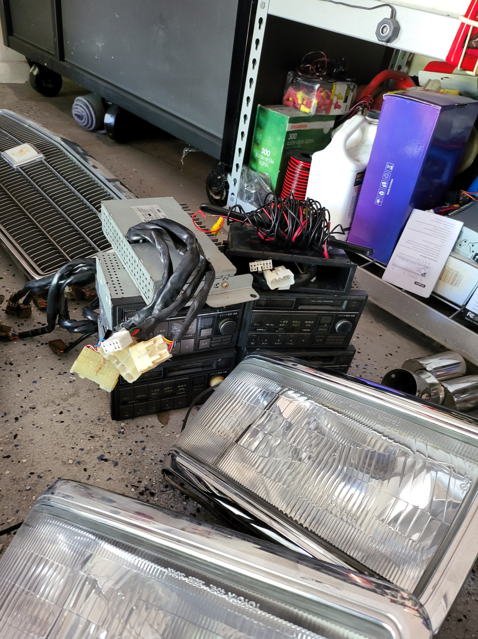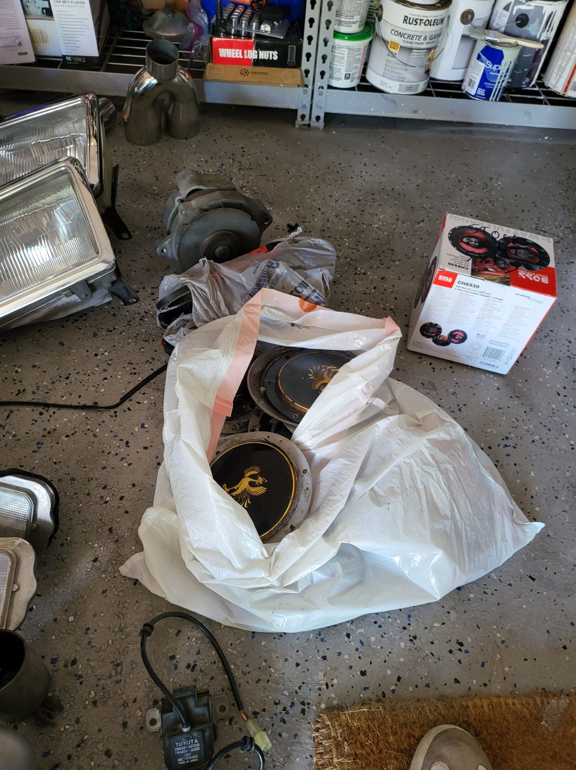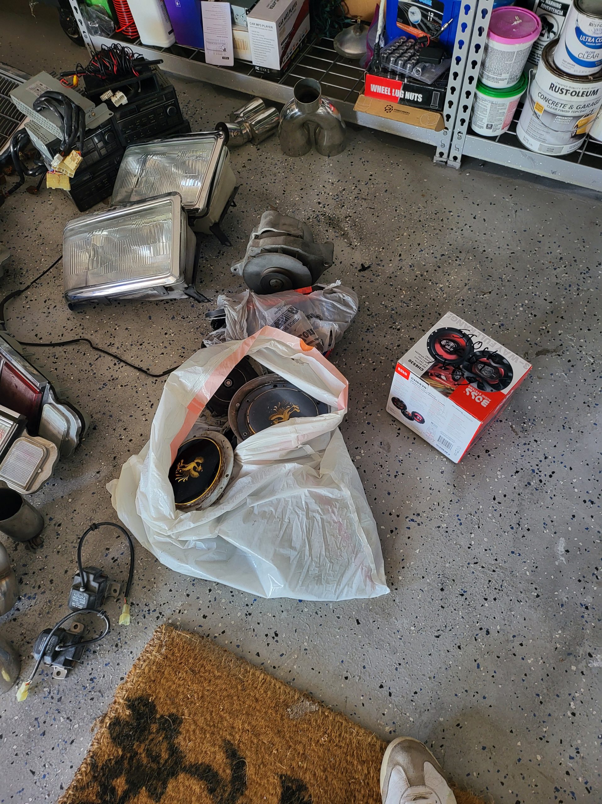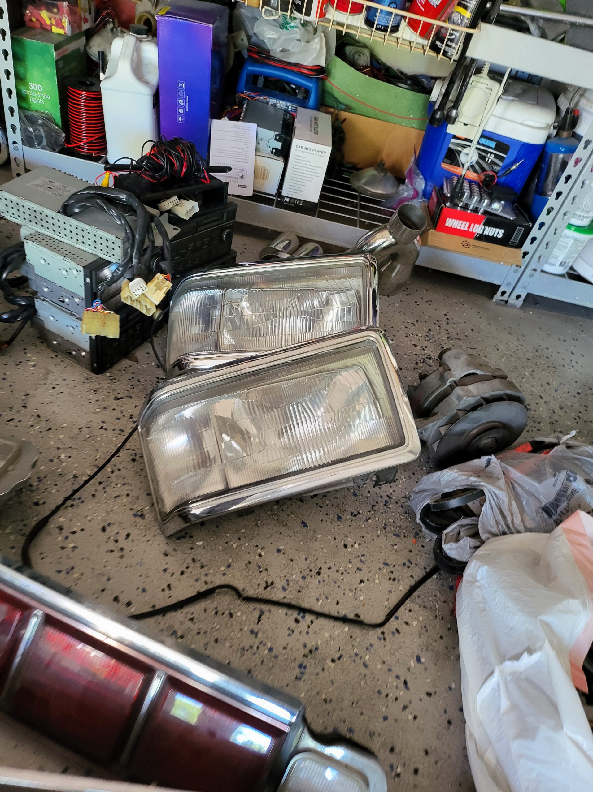 Bunch of stuff i’ve accumulated over the last 3 years. Spare set of headlights, spare alternator, multiple stock head units, extra stock amp, extra stock grill, miscellaneous exhaust tips as well as the factory exhaust tip, spare brake rotors and brake pads, spare center caps in various colors, 2 sets of custom tail lights (one is factory with LED panels, one is more custom from japan with crackle ice lenses and swarovski trim), spare radiator, stock speakers (car has upgraded aftermarket speakers in it)