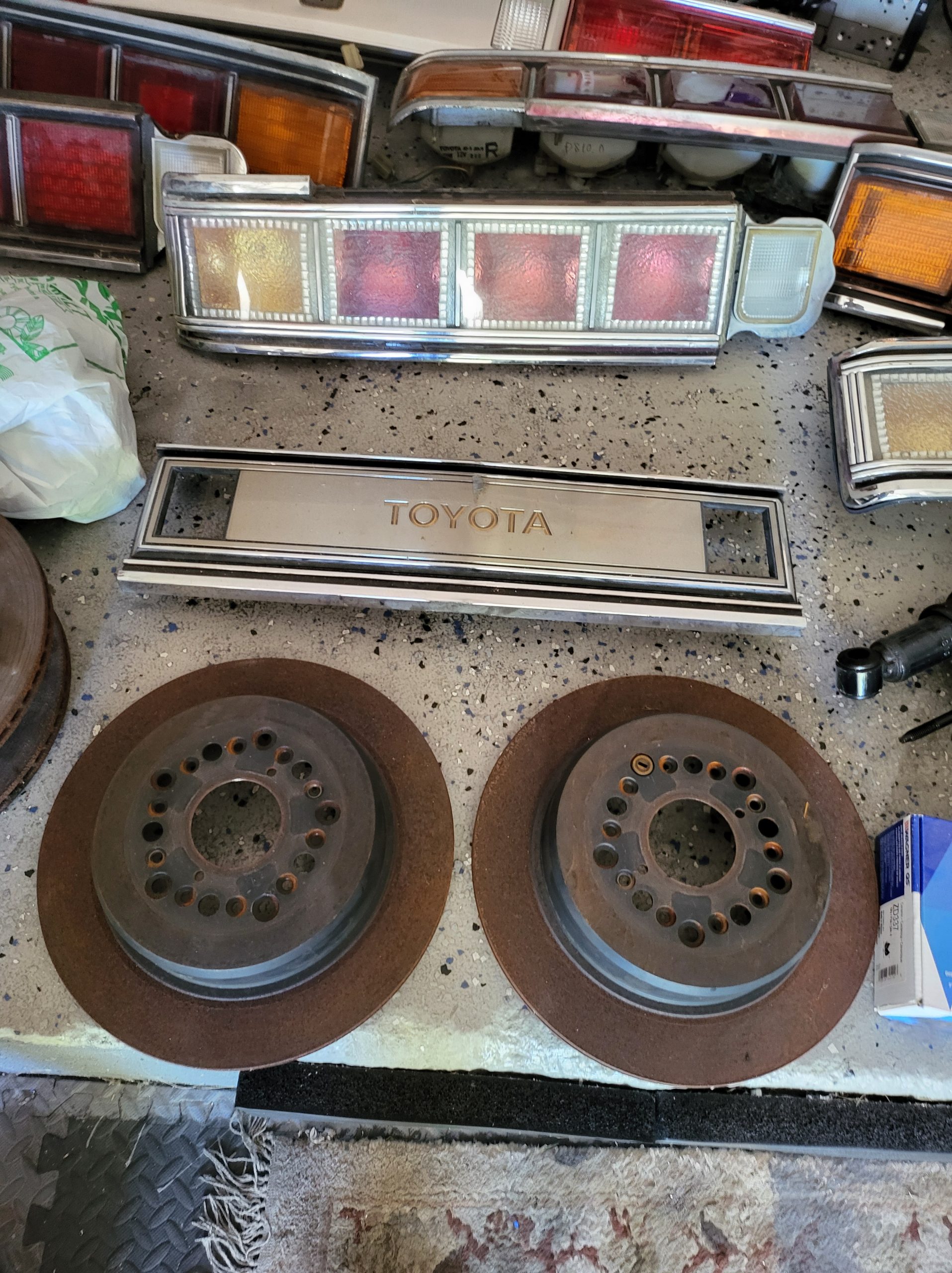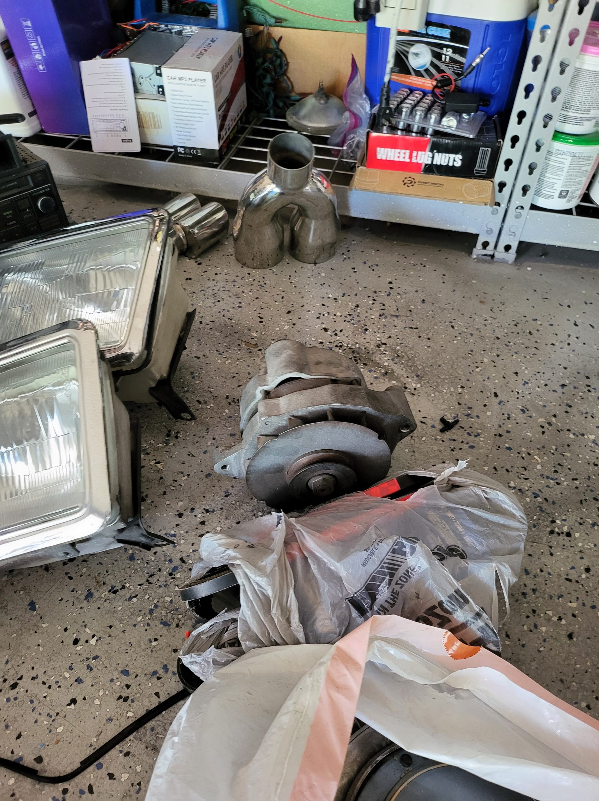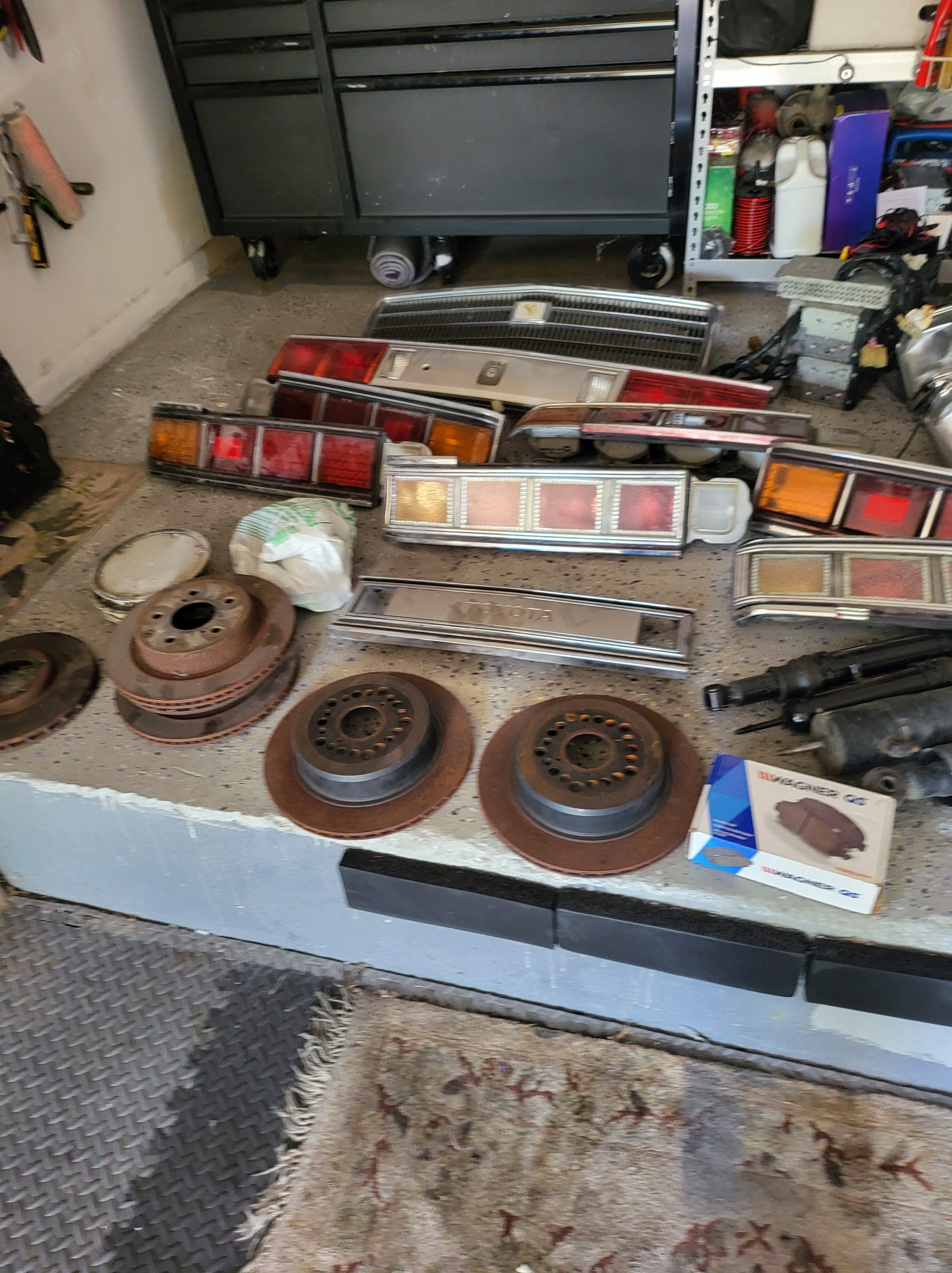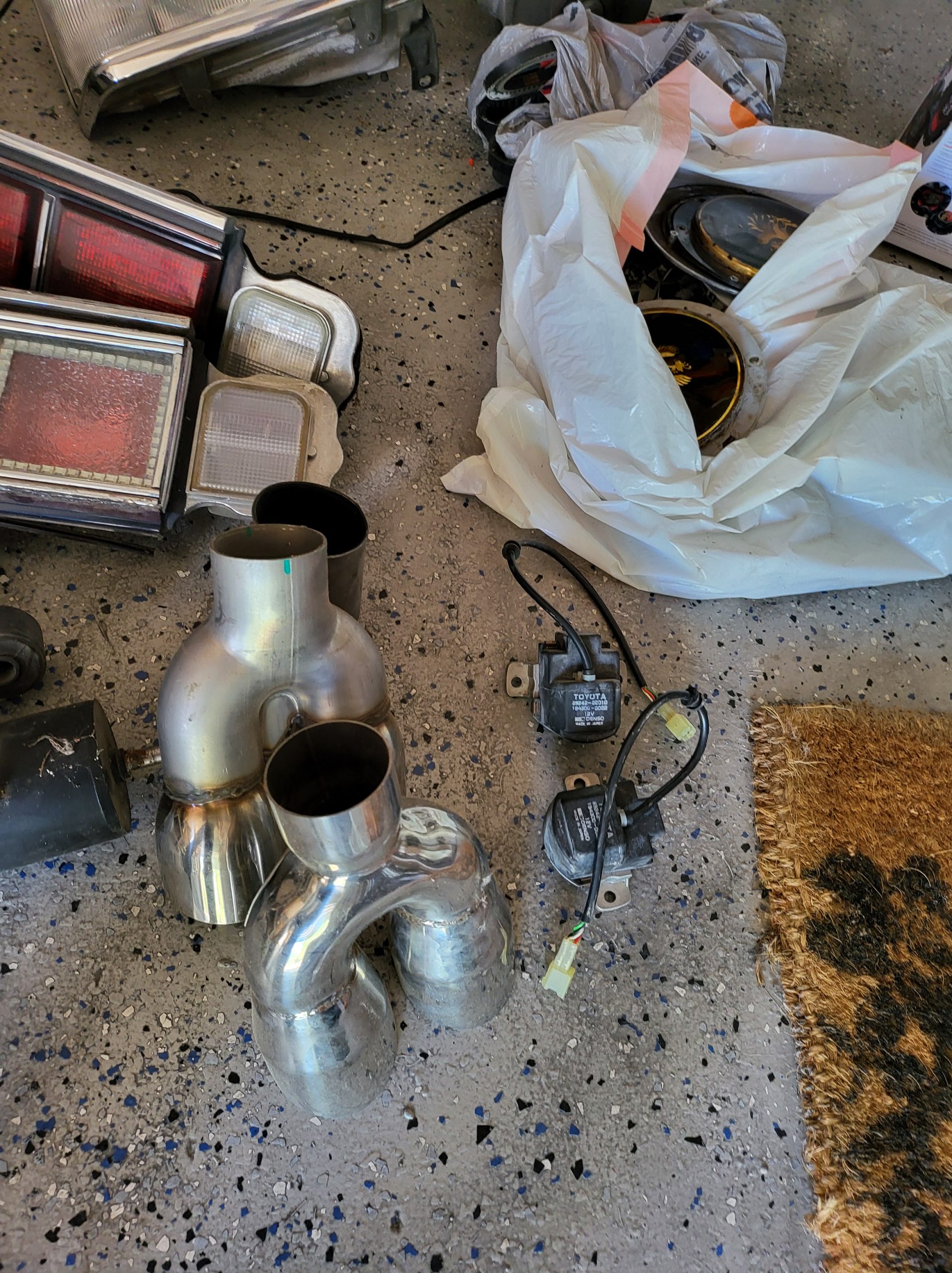 Bunch of stuff i’ve accumulated over the last 3 years. Spare set of headlights, spare alternator, multiple stock head units, extra stock amp, extra stock grill, miscellaneous exhaust tips as well as the factory exhaust tip, spare brake rotors and brake pads, spare center caps in various colors, 2 sets of custom tail lights (one is factory with LED panels, one is more custom from japan with crackle ice lenses and swarovski trim), spare radiator, stock speakers (car has upgraded aftermarket speakers in it)