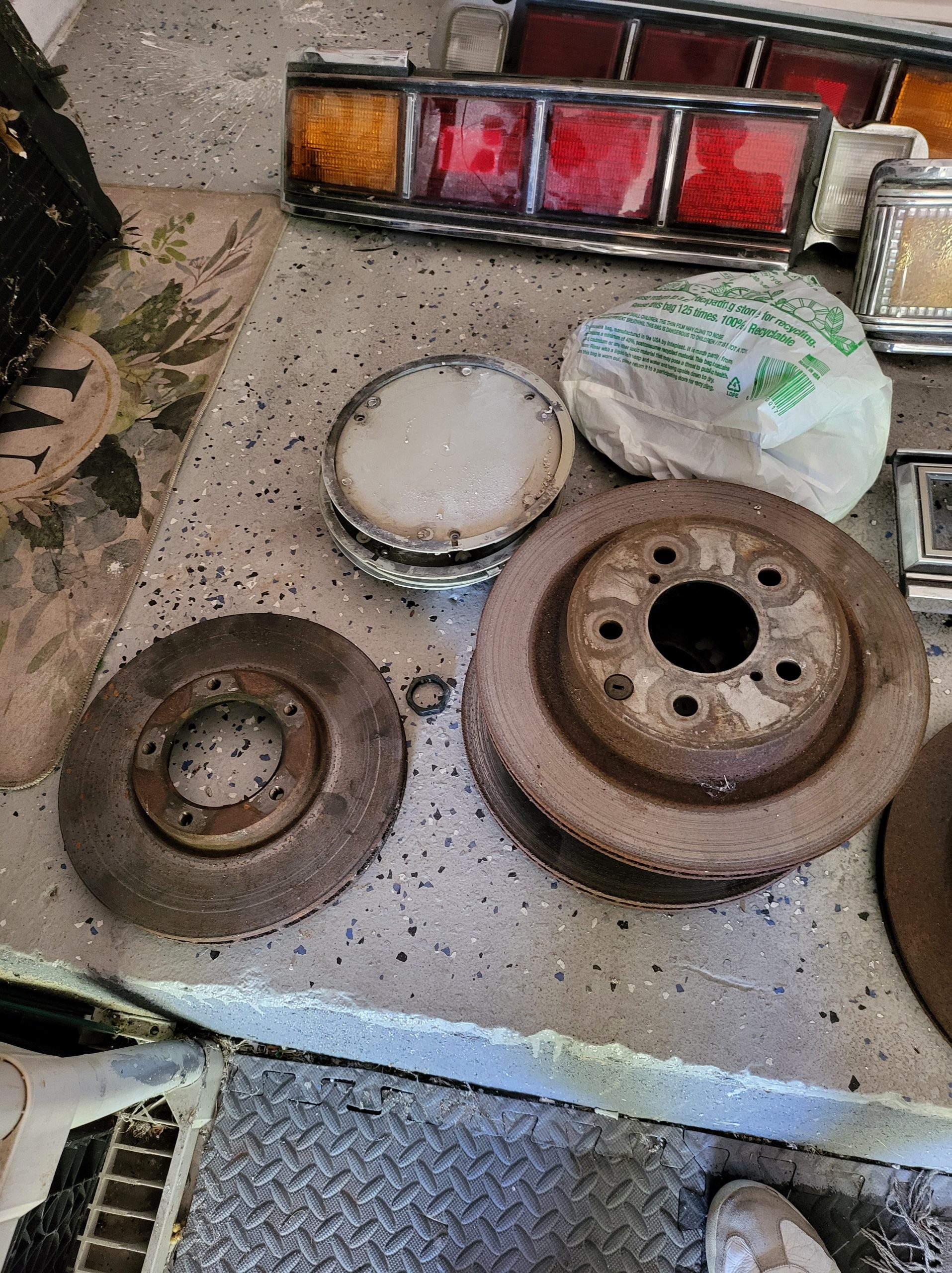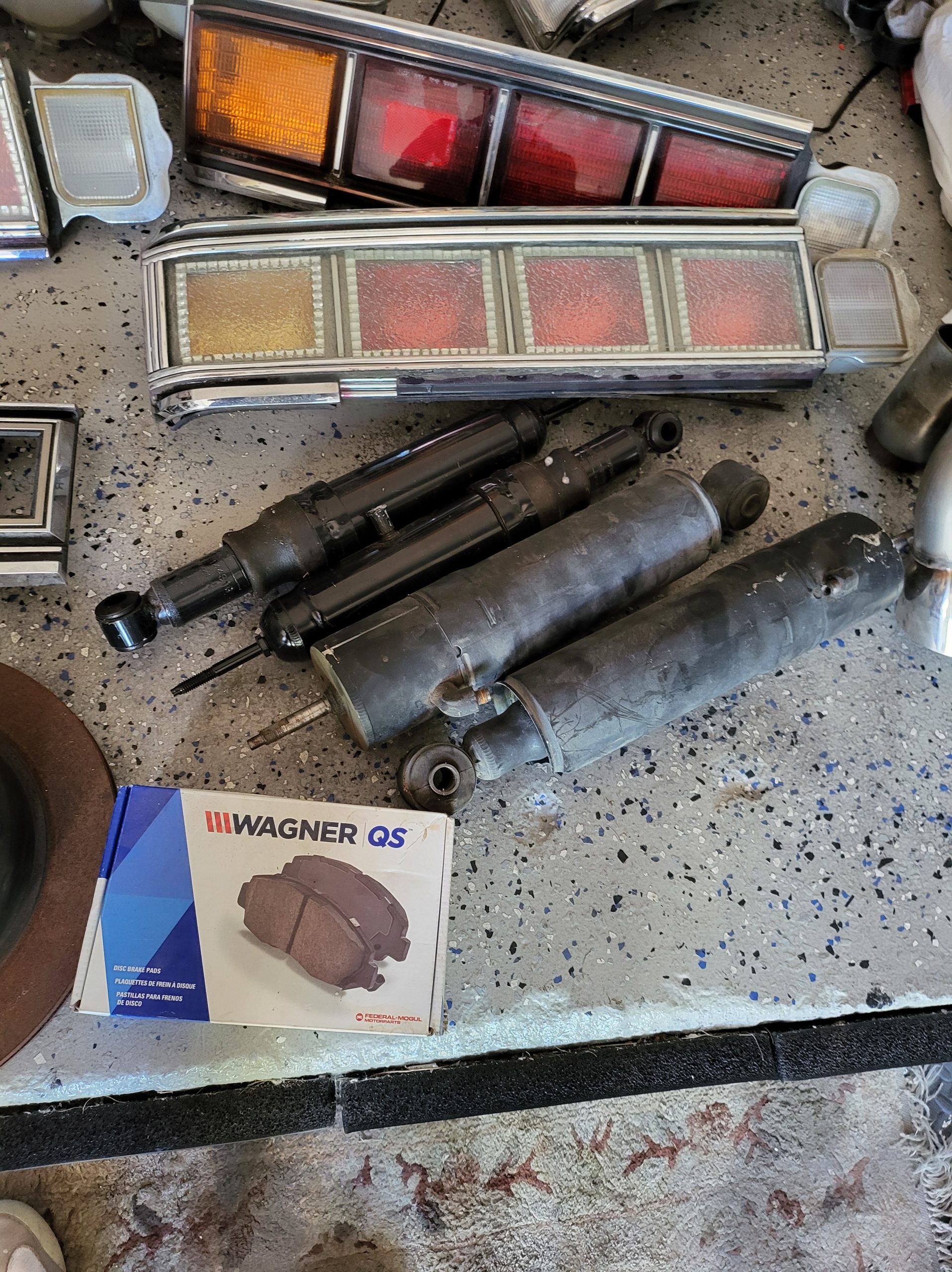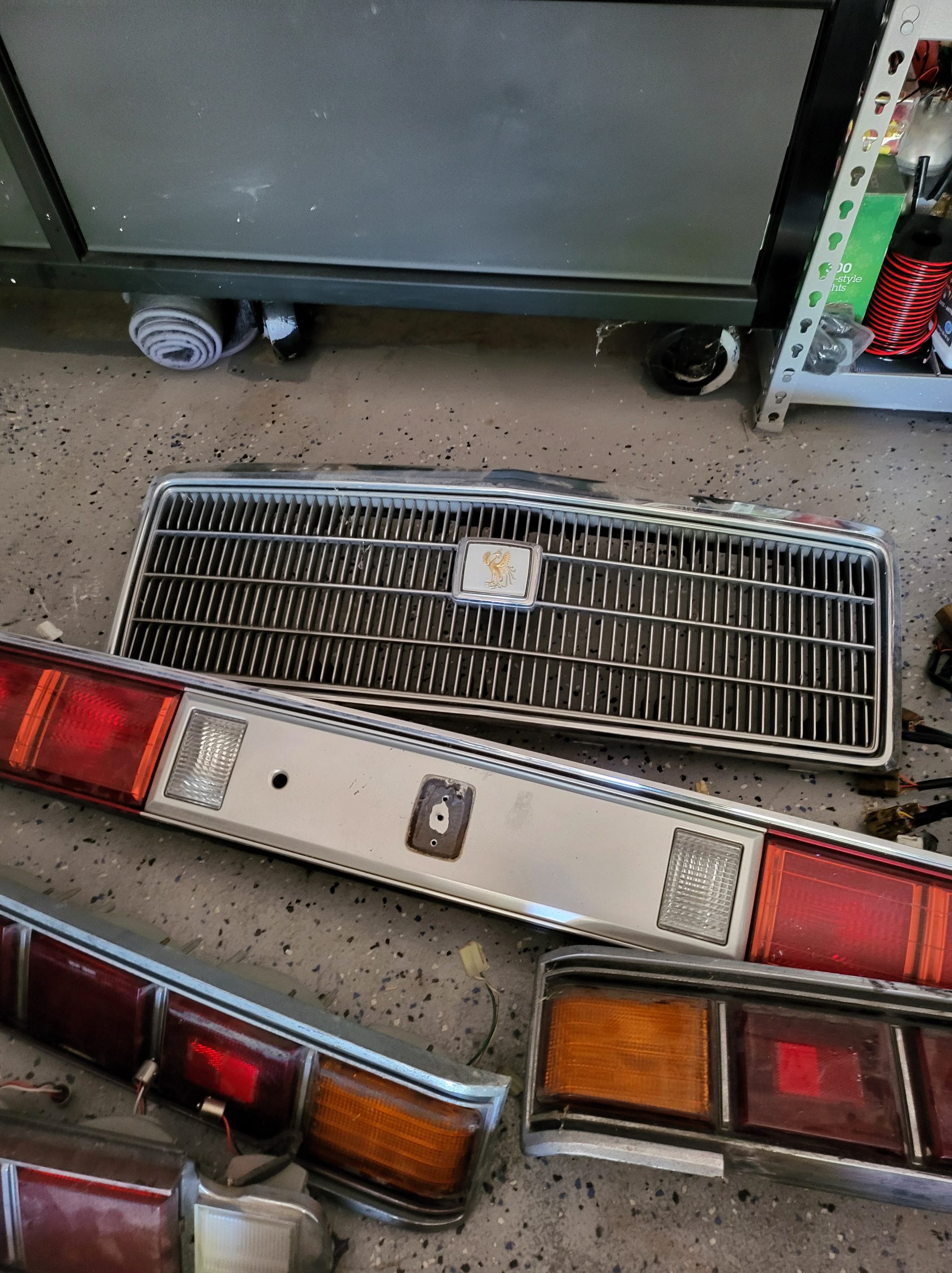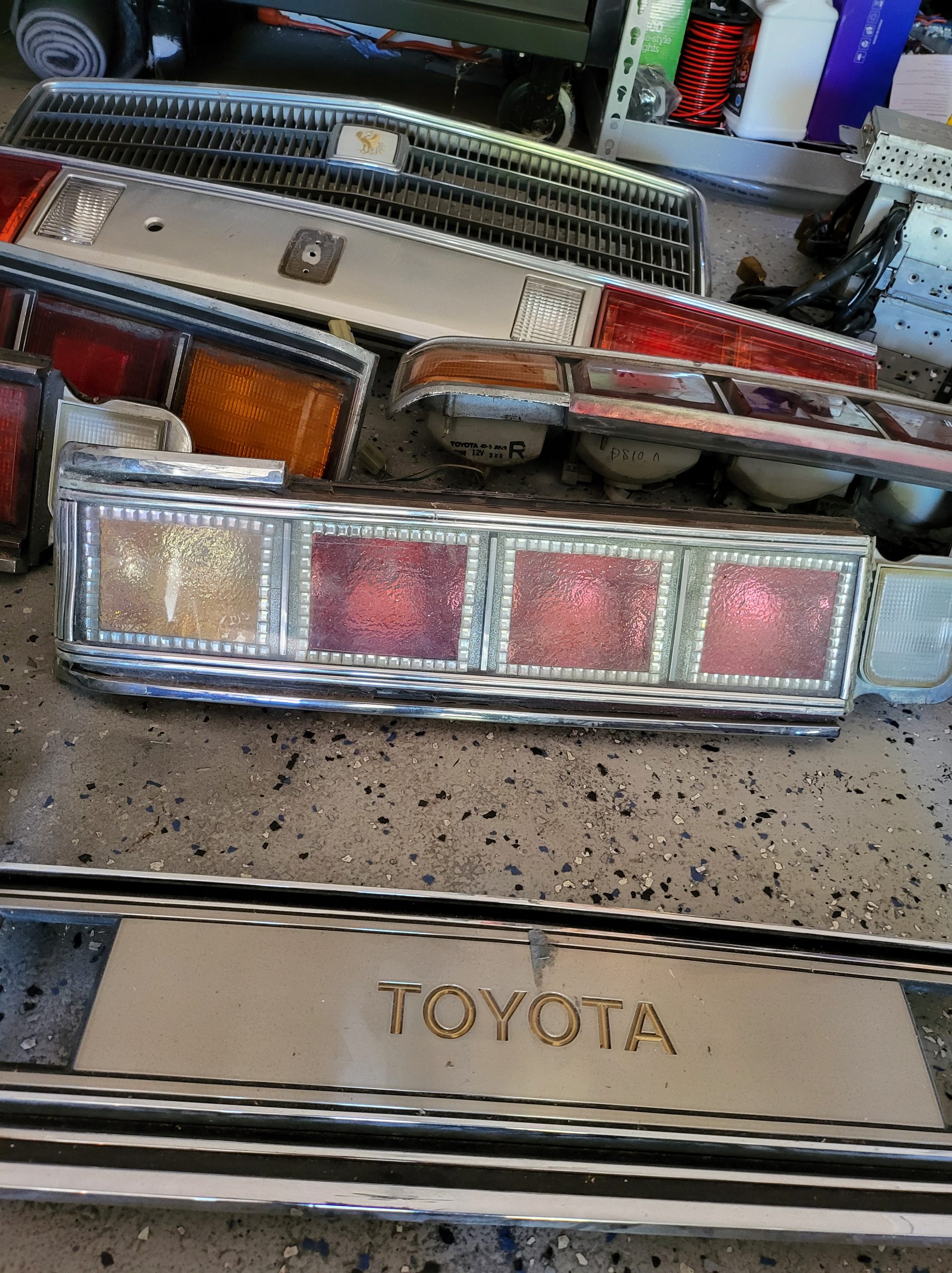 Bunch of stuff i’ve accumulated over the last 3 years. Spare set of headlights, spare alternator, multiple stock head units, extra stock amp, extra stock grill, miscellaneous exhaust tips as well as the factory exhaust tip, spare brake rotors and brake pads, spare center caps in various colors, 2 sets of custom tail lights (one is factory with LED panels, one is more custom from japan with crackle ice lenses and swarovski trim), spare radiator, stock speakers (car has upgraded aftermarket speakers in it)