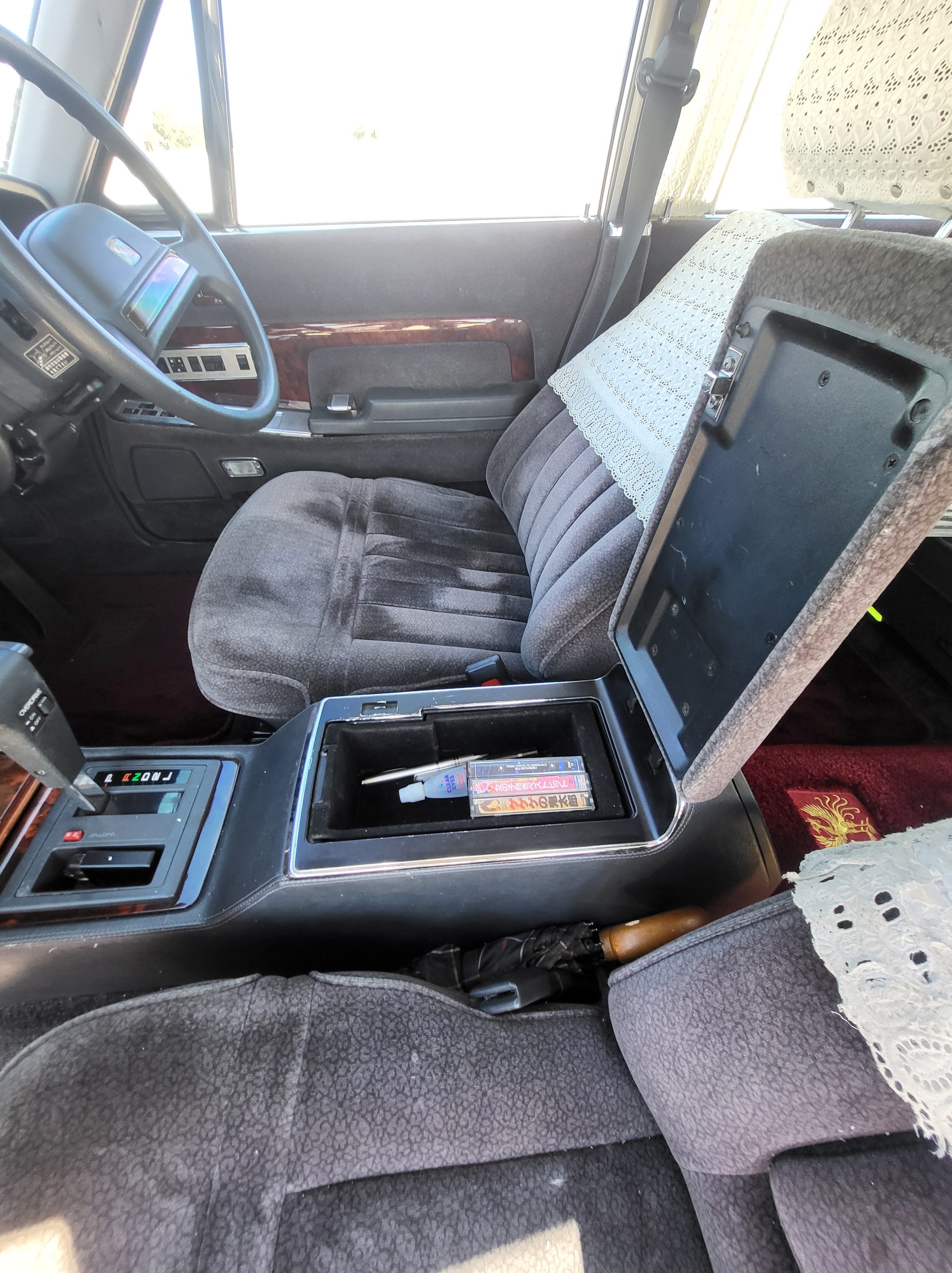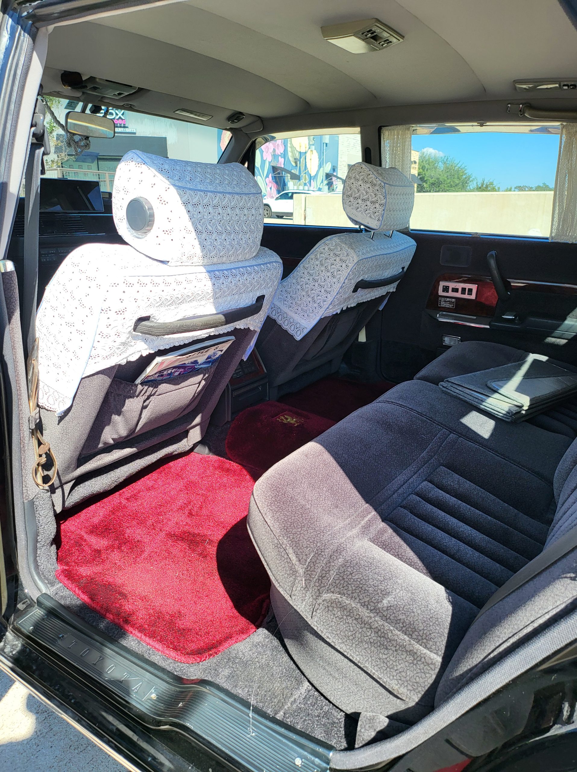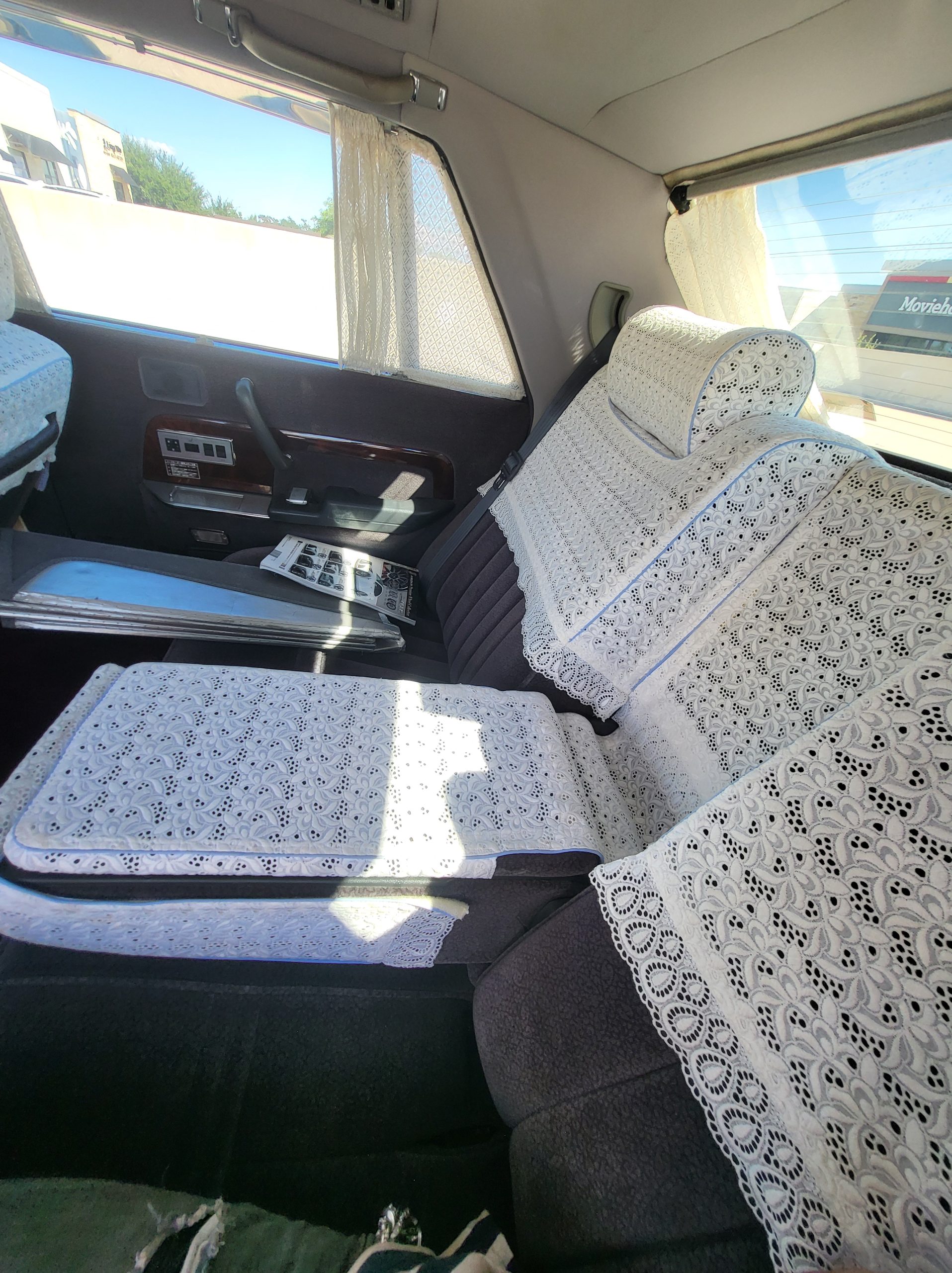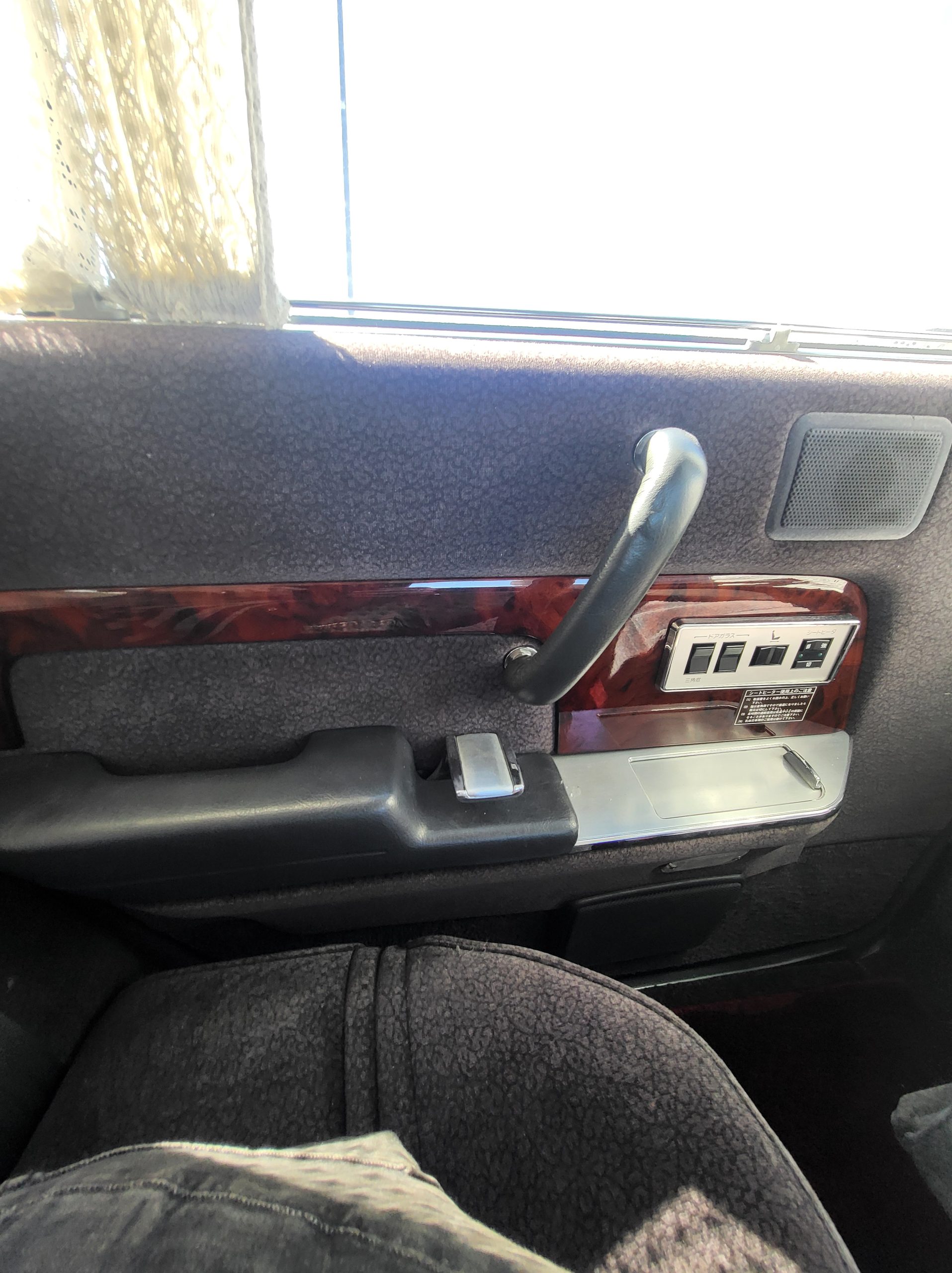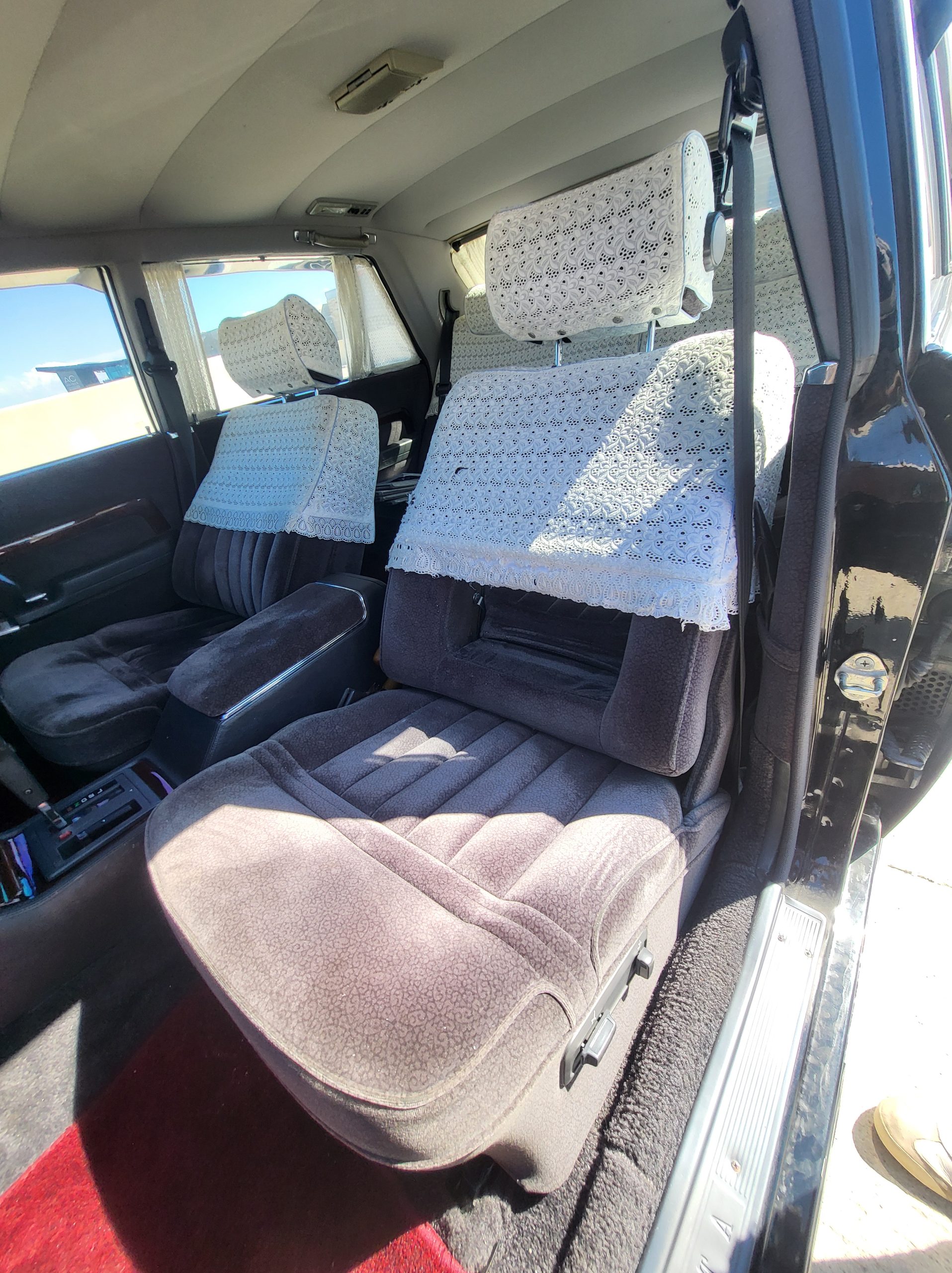 Had to buy 5 head units to find one where the tape deck still works. Didn’t want to ruin the vibe with a goofy looking aftermarket unit. The bottom slot under the radio is a (extremely rare) car phone unit; it doesn’t do anything but it looks cool. Every seat has it’s own cigarette lighter. All the wood trim that looks like plastic is actually solid blocks of milled burl wood (see the edge of the center pocket), Car is tinted all the way around including the windshiled with super light blue 99% UV blocking heat rejection film; I forget the brand but it was whatever the best one that they sold at the time (not cheap). Interior lace covers and curtains have been freshly dry cleaned. Including a few vintage japanese casettes in the arm rest. Also this shows the controls for the seat massagers, the seat heaters, and the controls for the rear passenger to move up the front seats if they choose. There are some cigarette burns on the driver A pillar from the previous owner, haven’t been able to source a replacement for that yet but I can help you do this. Gauge cluster works, basically everything works perfect. Couple cracks in the lower front kick panel. Head liner is mint. Floor mats are near mint, little bit of wear on the driver mat.