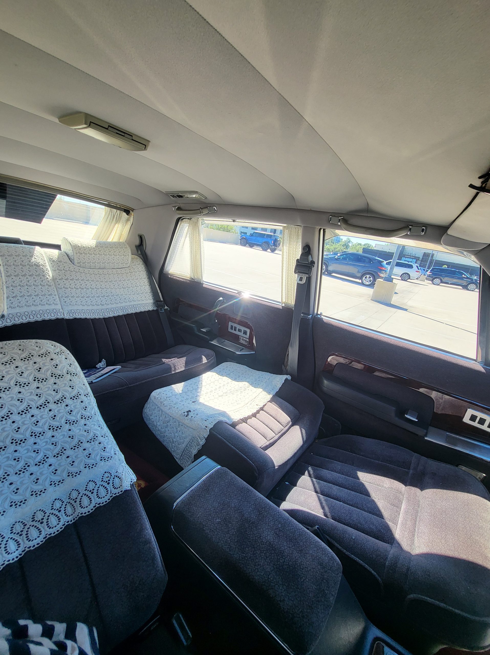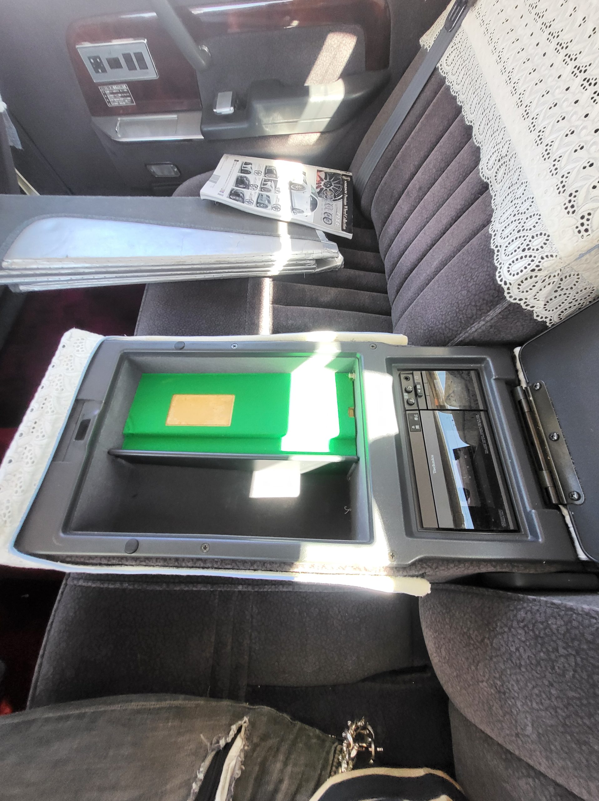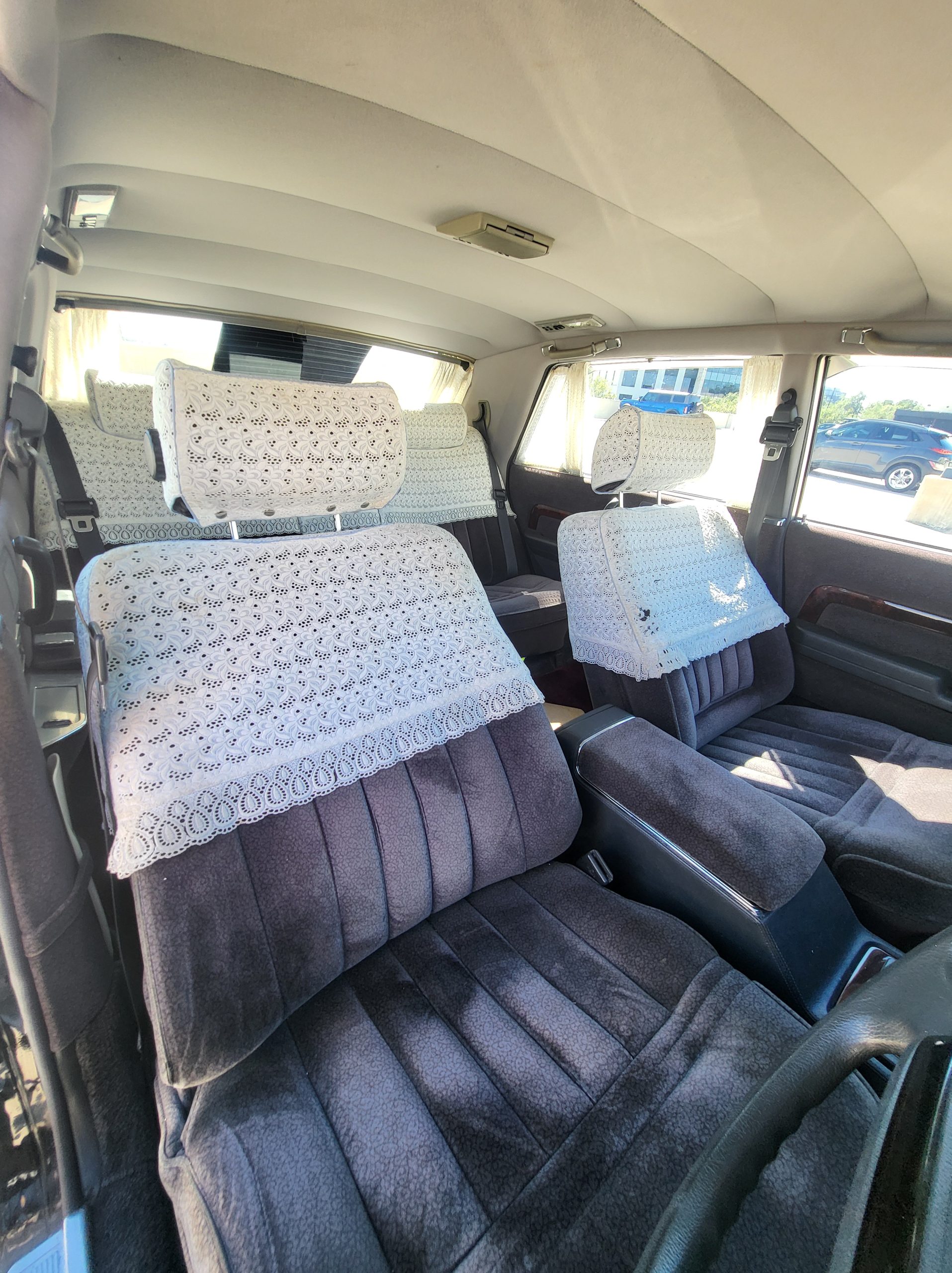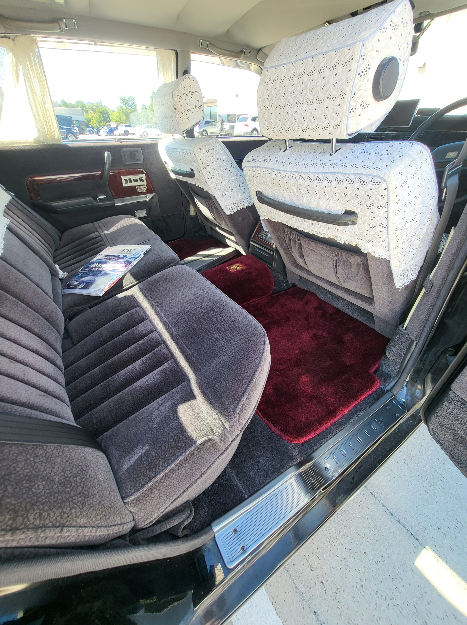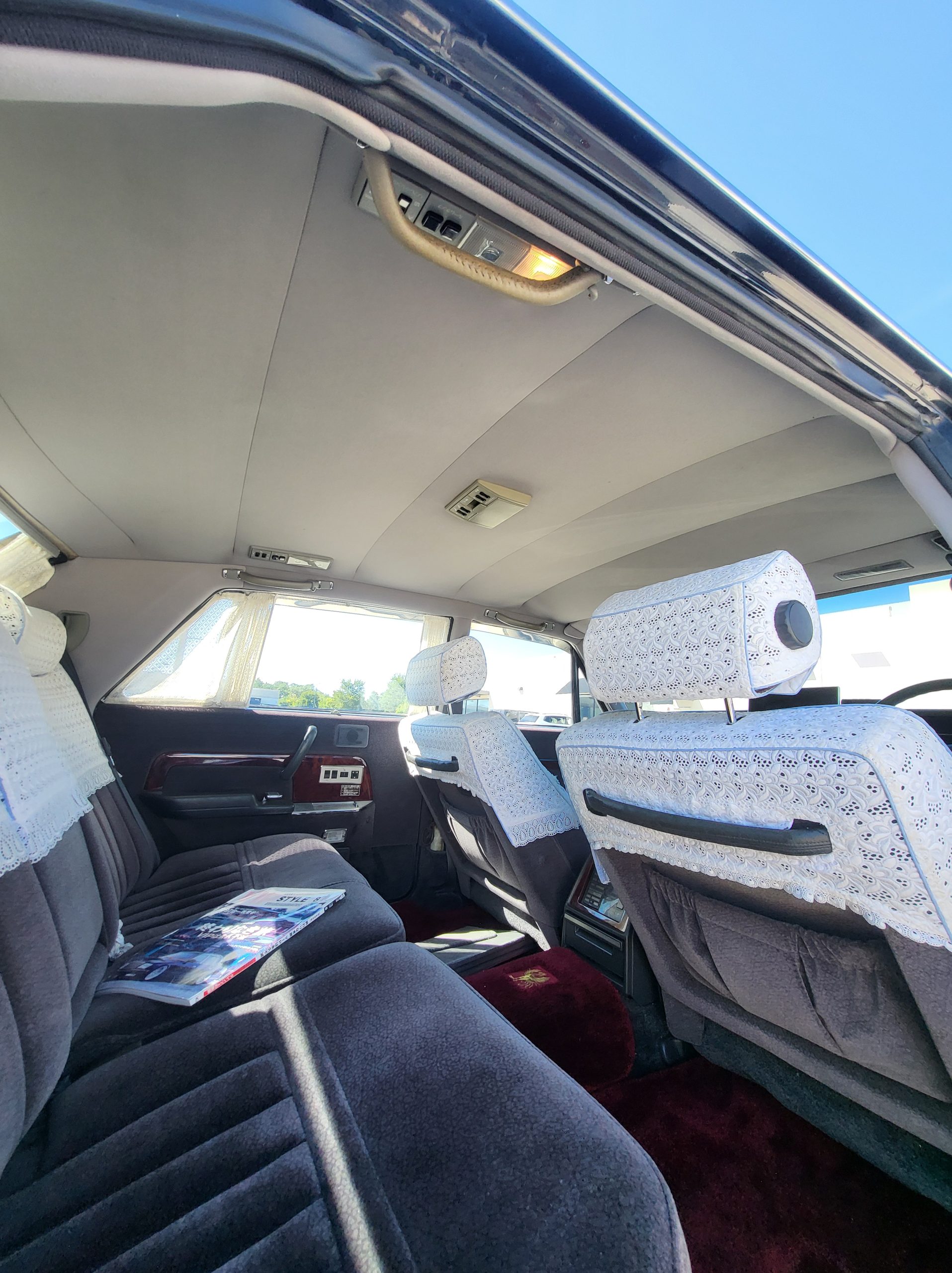 Had to buy 5 head units to find one where the tape deck still works. Didn’t want to ruin the vibe with a goofy looking aftermarket unit. The bottom slot under the radio is a (extremely rare) car phone unit; it doesn’t do anything but it looks cool. Every seat has it’s own cigarette lighter. All the wood trim that looks like plastic is actually solid blocks of milled burl wood (see the edge of the center pocket), Car is tinted all the way around including the windshiled with super light blue 99% UV blocking heat rejection film; I forget the brand but it was whatever the best one that they sold at the time (not cheap). Interior lace covers and curtains have been freshly dry cleaned. Including a few vintage japanese casettes in the arm rest. Also this shows the controls for the seat massagers, the seat heaters, and the controls for the rear passenger to move up the front seats if they choose. There are some cigarette burns on the driver A pillar from the previous owner, haven’t been able to source a replacement for that yet but I can help you do this. Gauge cluster works, basically everything works perfect. Couple cracks in the lower front kick panel. Head liner is mint. Floor mats are near mint, little bit of wear on the driver mat.