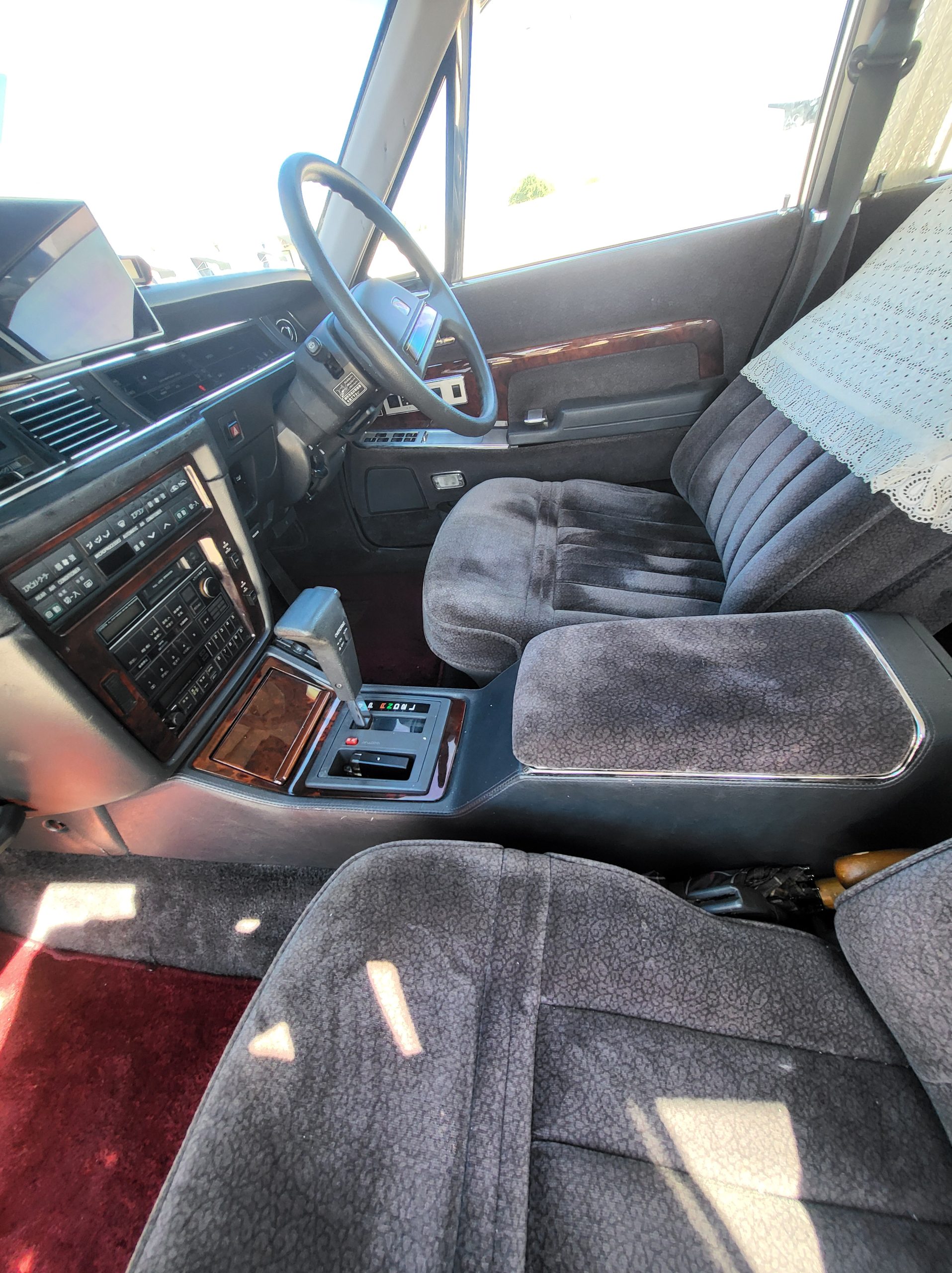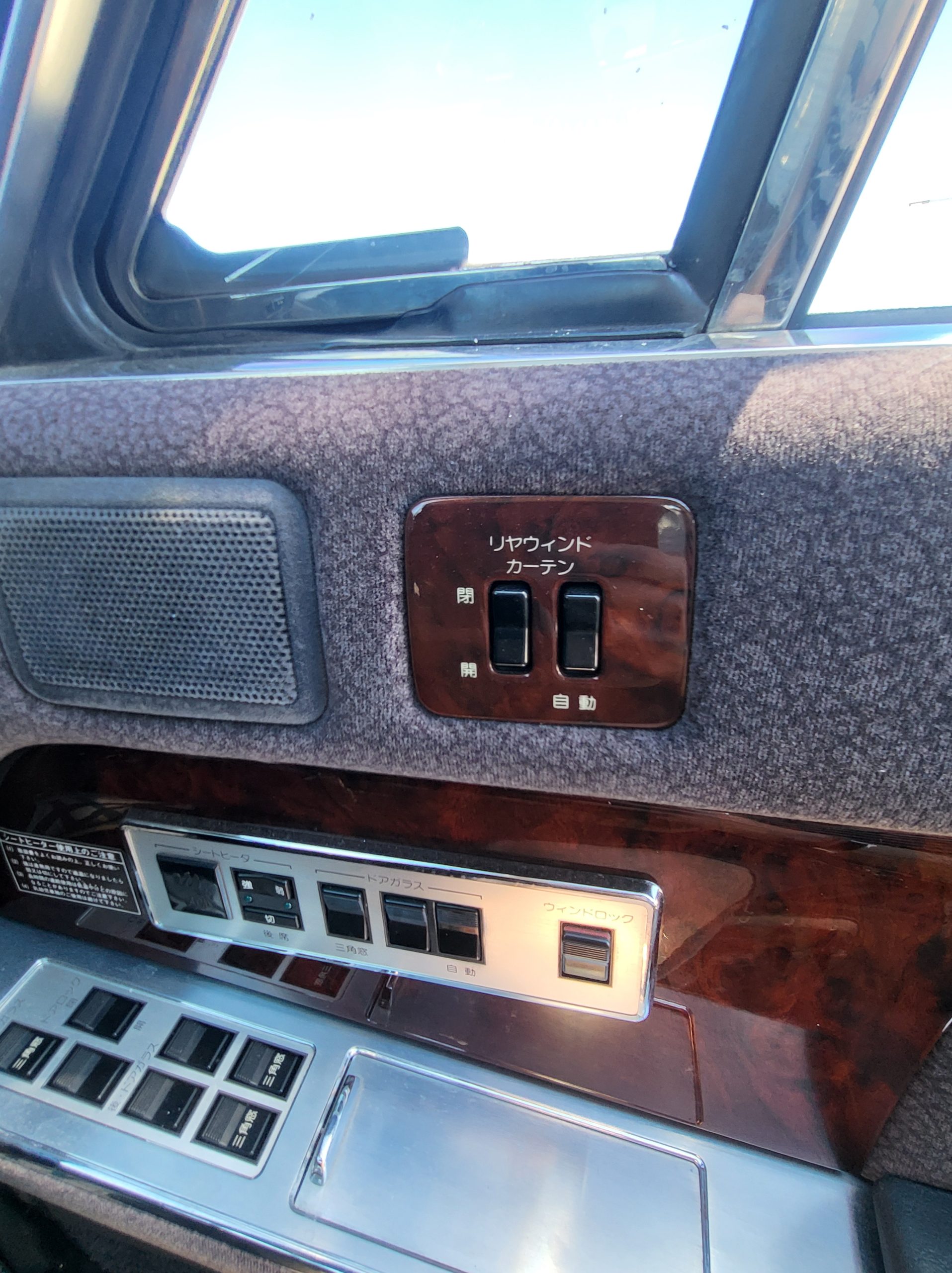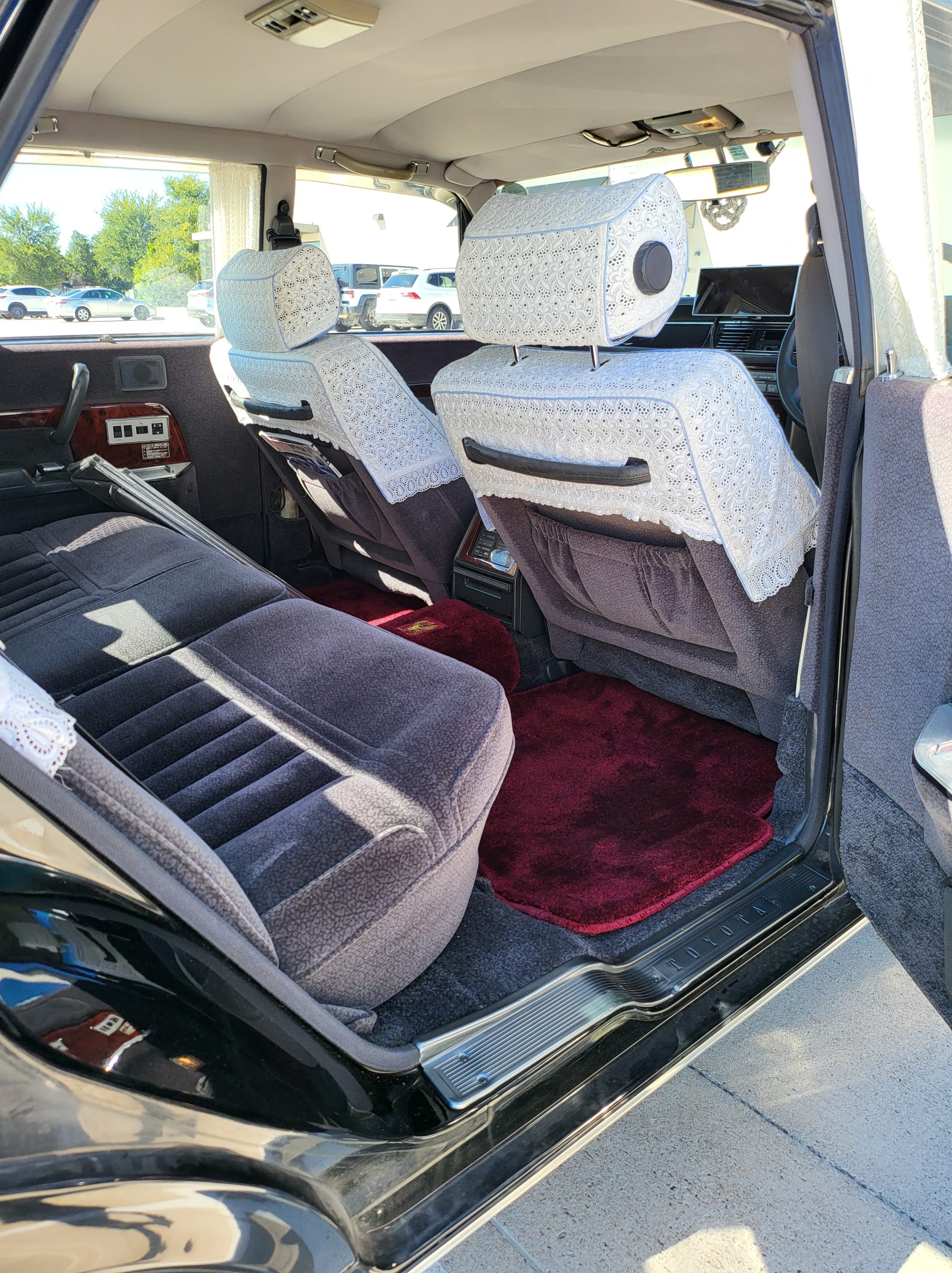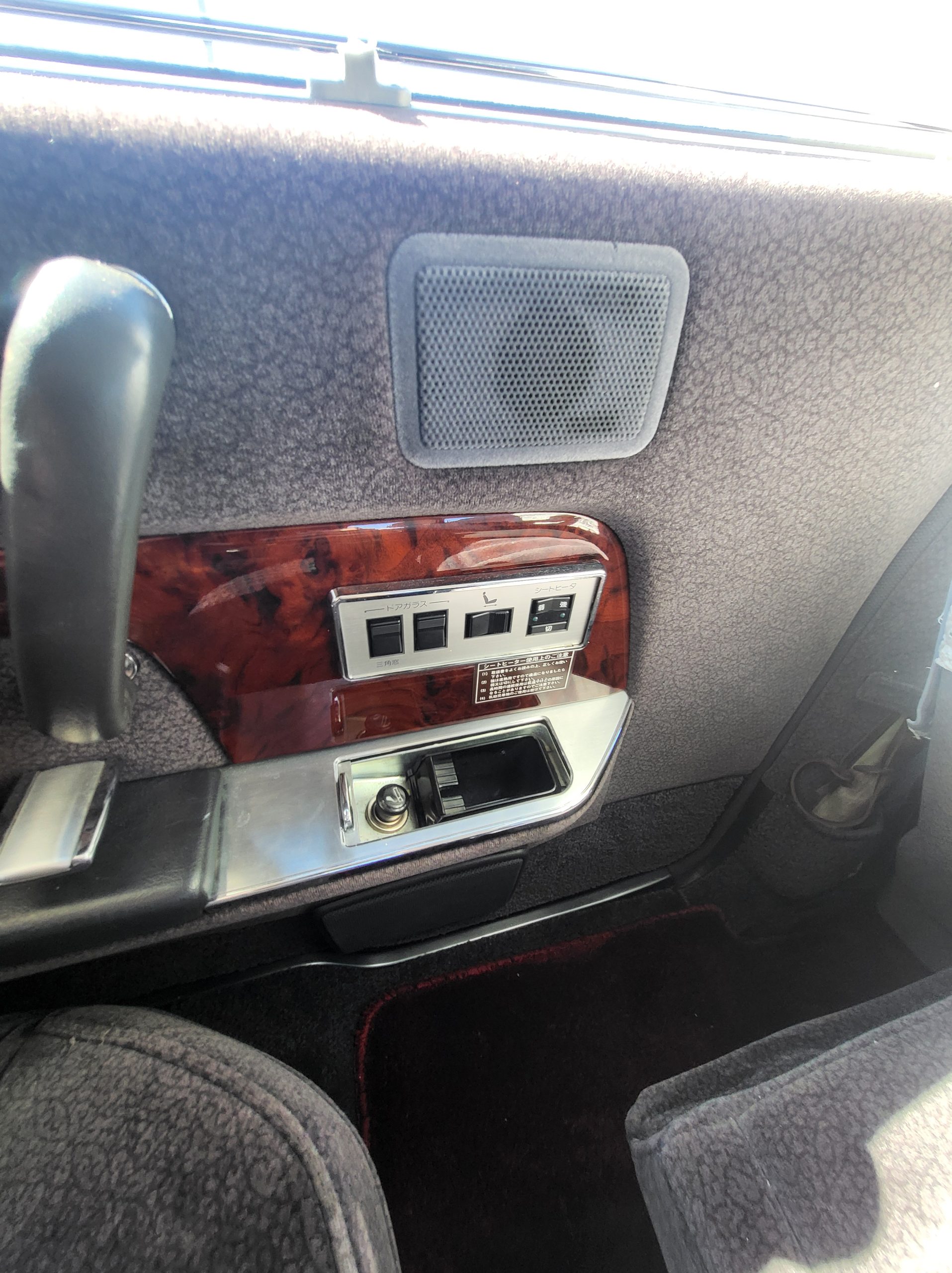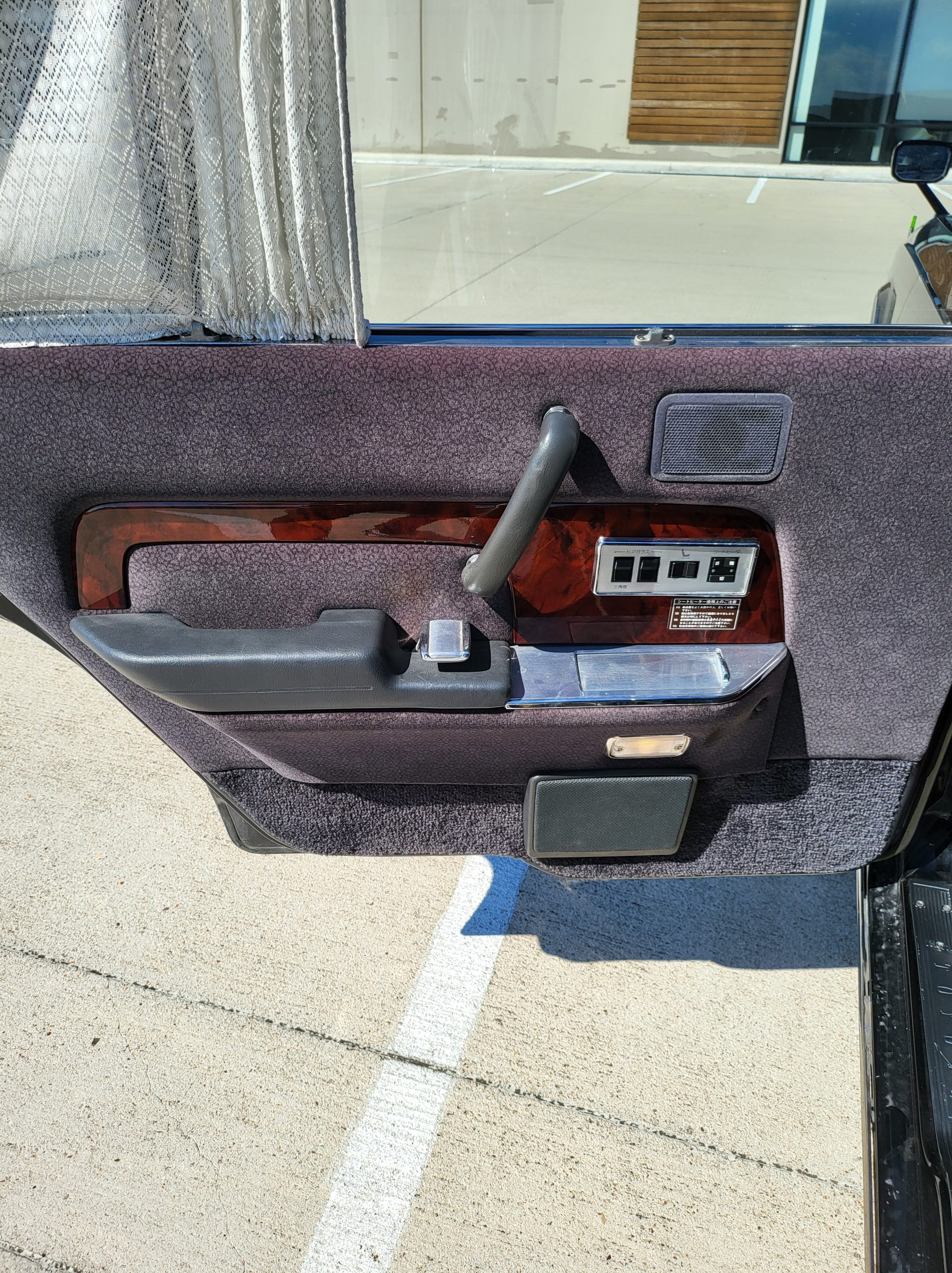 Had to buy 5 head units to find one where the tape deck still works. Didn’t want to ruin the vibe with a goofy looking aftermarket unit. The bottom slot under the radio is a (extremely rare) car phone unit; it doesn’t do anything but it looks cool. Every seat has it’s own cigarette lighter. All the wood trim that looks like plastic is actually solid blocks of milled burl wood (see the edge of the center pocket), Car is tinted all the way around including the windshiled with super light blue 99% UV blocking heat rejection film; I forget the brand but it was whatever the best one that they sold at the time (not cheap). Interior lace covers and curtains have been freshly dry cleaned. Including a few vintage japanese casettes in the arm rest. Also this shows the controls for the seat massagers, the seat heaters, and the controls for the rear passenger to move up the front seats if they choose. There are some cigarette burns on the driver A pillar from the previous owner, haven’t been able to source a replacement for that yet but I can help you do this. Gauge cluster works, basically everything works perfect. Couple cracks in the lower front kick panel. Head liner is mint. Floor mats are near mint, little bit of wear on the driver mat.