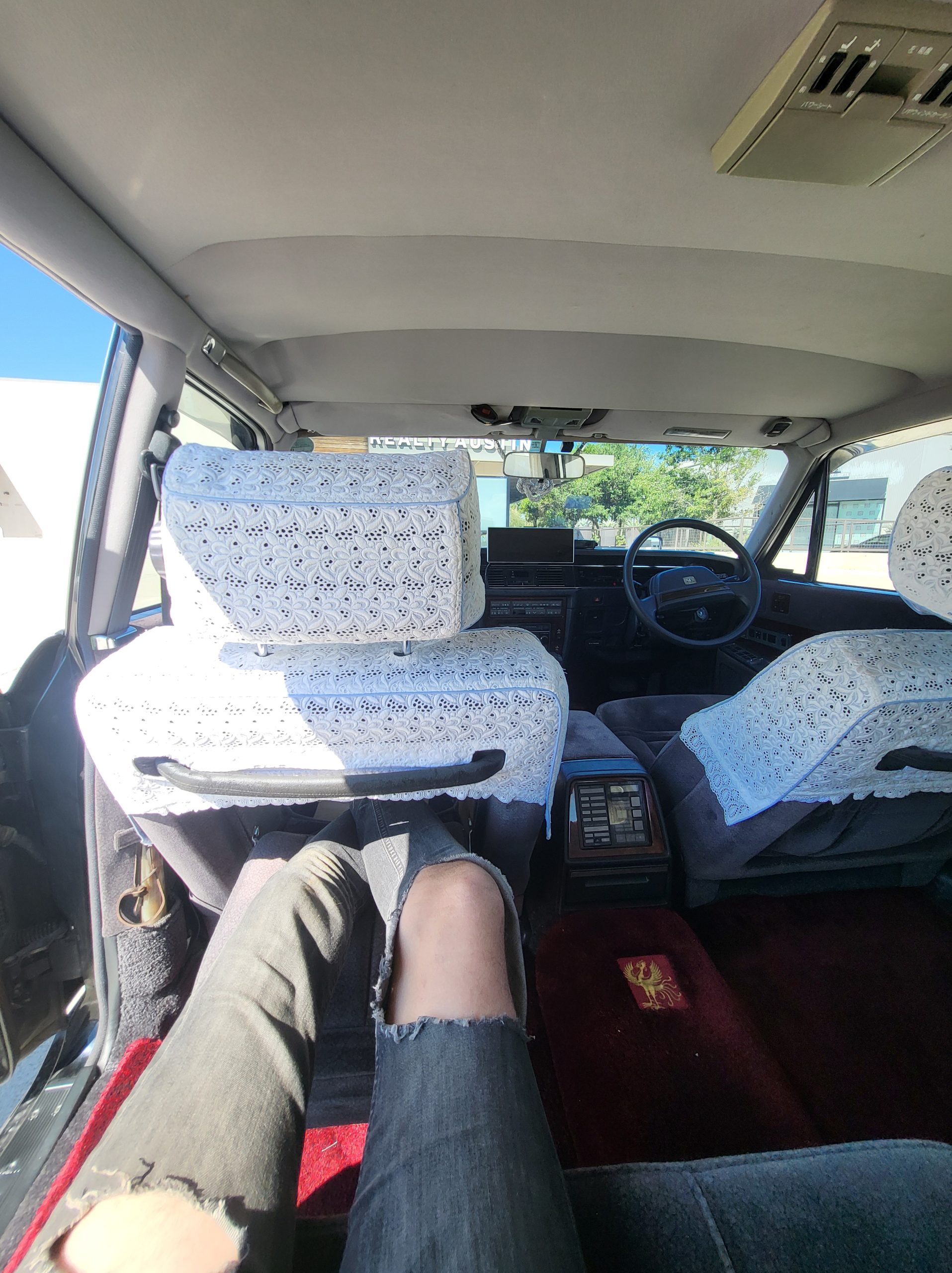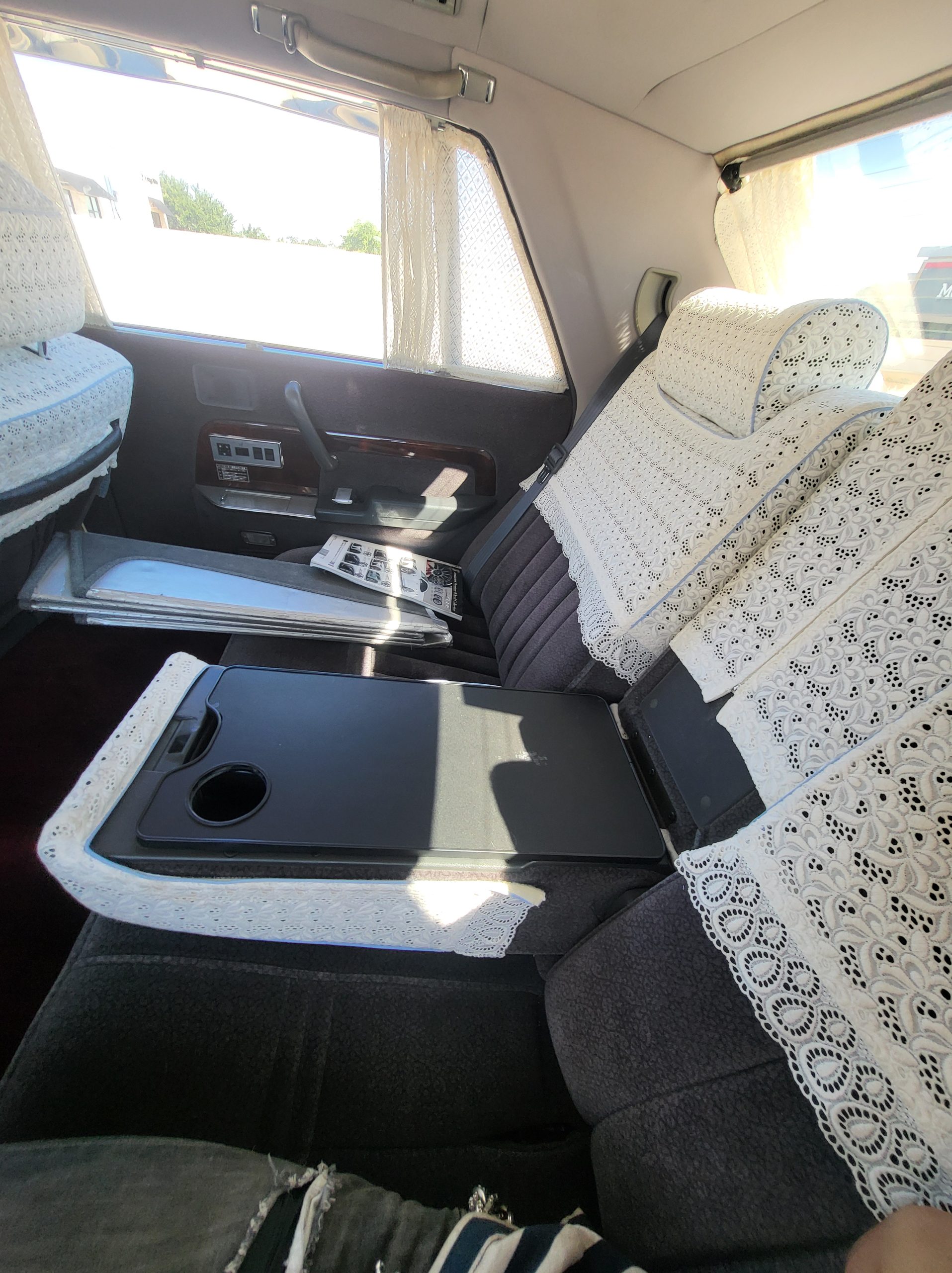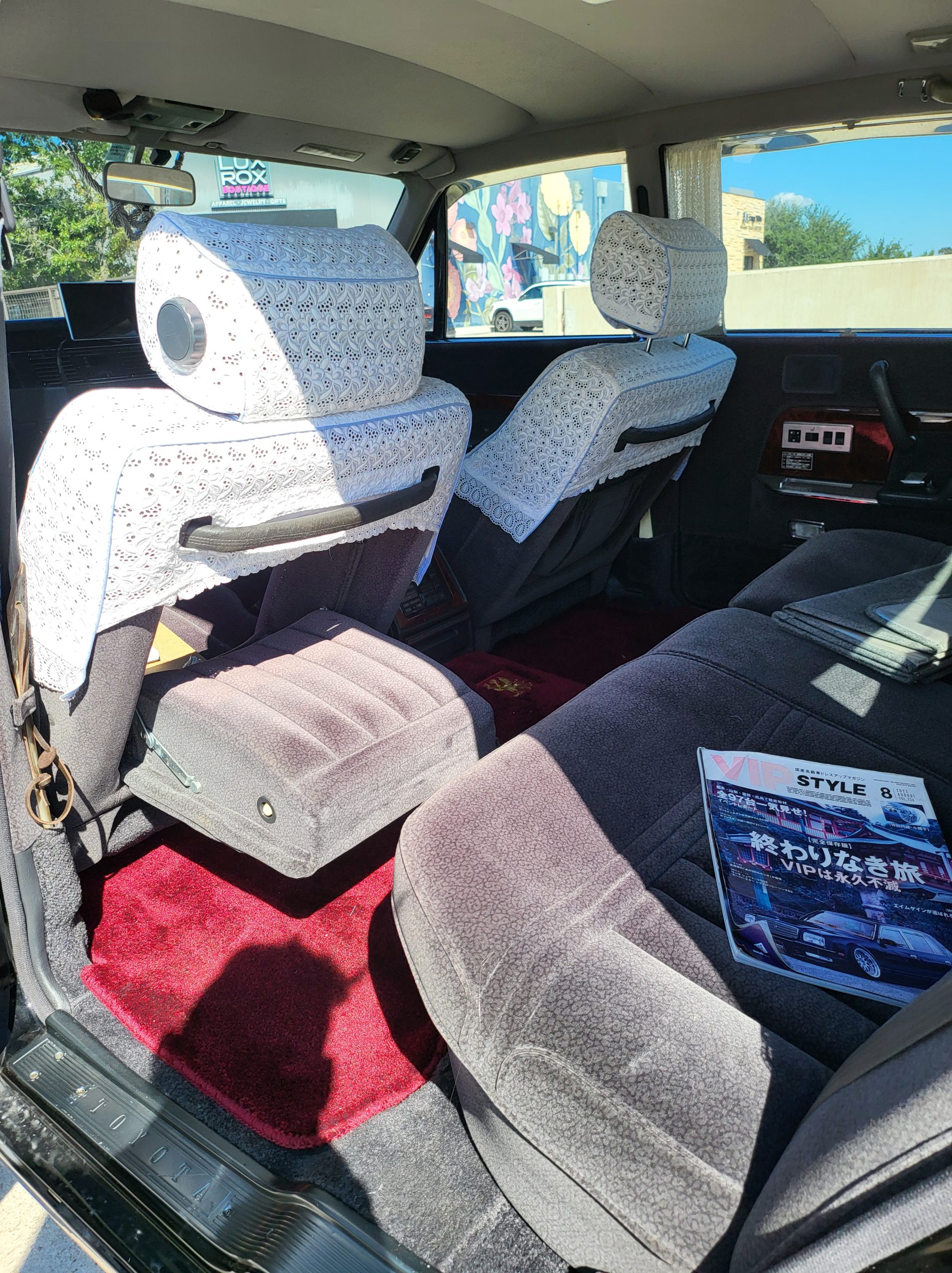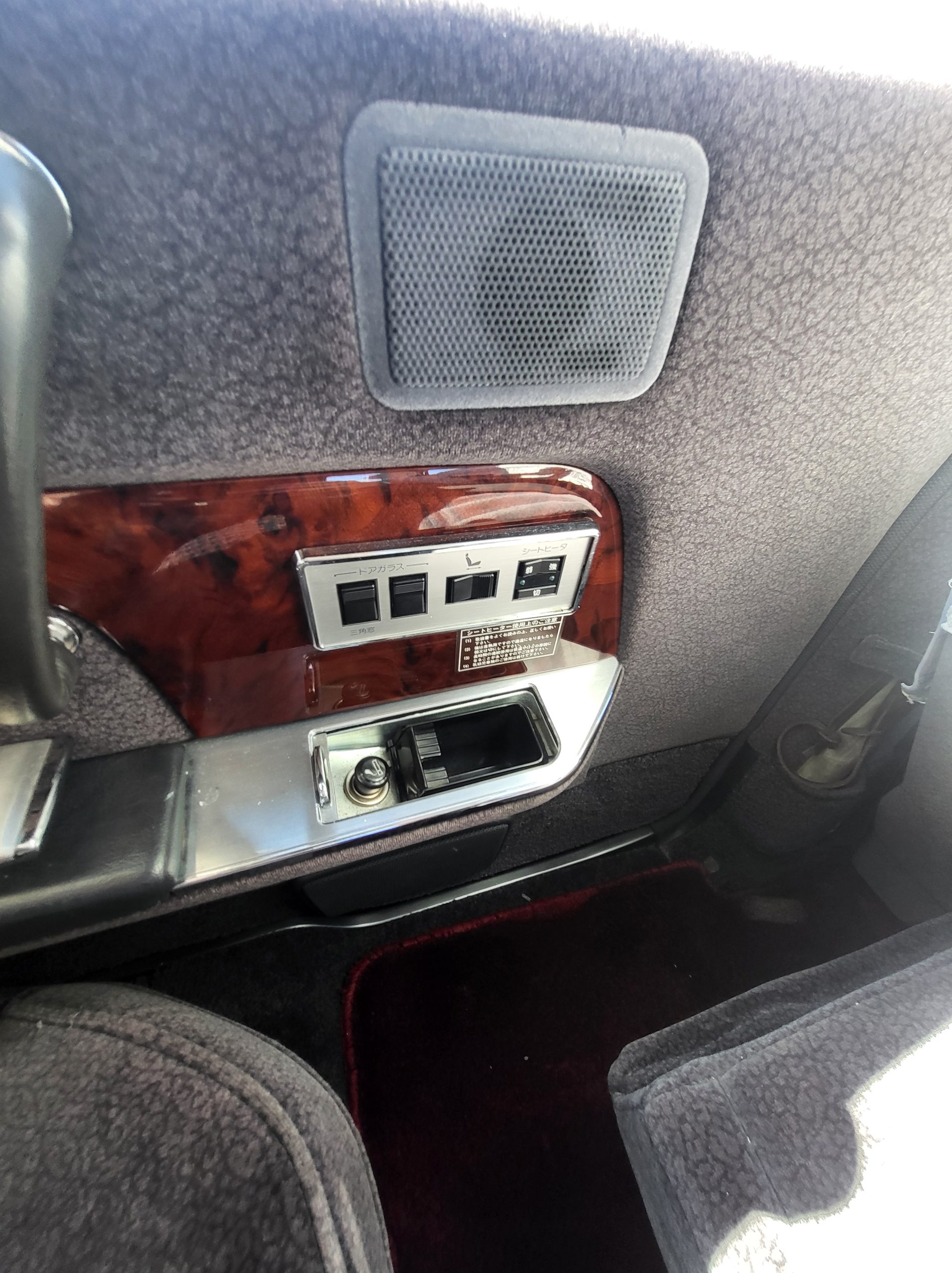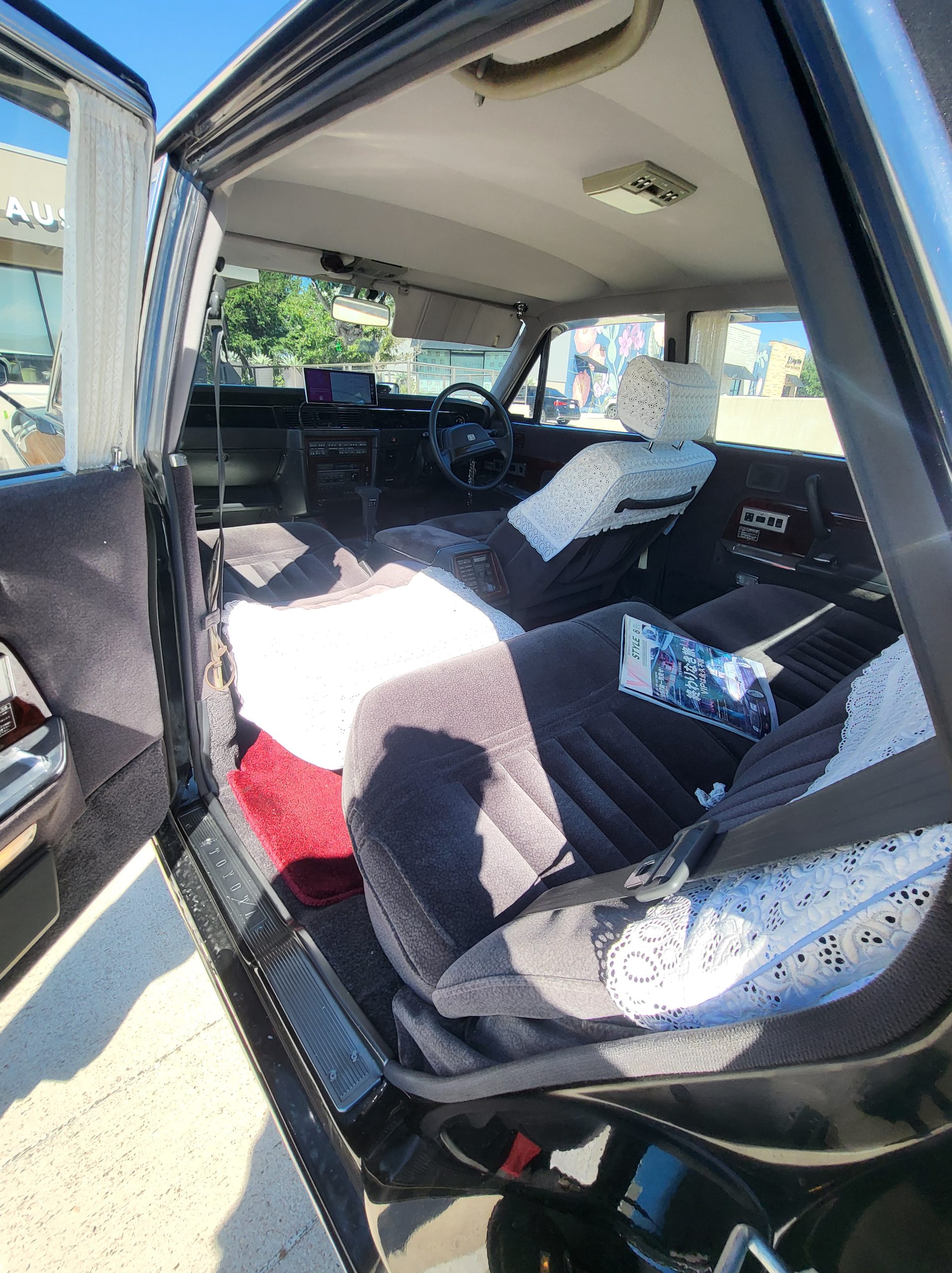 Had to buy 5 head units to find one where the tape deck still works. Didn’t want to ruin the vibe with a goofy looking aftermarket unit. The bottom slot under the radio is a (extremely rare) car phone unit; it doesn’t do anything but it looks cool. Every seat has it’s own cigarette lighter. All the wood trim that looks like plastic is actually solid blocks of milled burl wood (see the edge of the center pocket), Car is tinted all the way around including the windshiled with super light blue 99% UV blocking heat rejection film; I forget the brand but it was whatever the best one that they sold at the time (not cheap). Interior lace covers and curtains have been freshly dry cleaned. Including a few vintage japanese casettes in the arm rest. Also this shows the controls for the seat massagers, the seat heaters, and the controls for the rear passenger to move up the front seats if they choose. There are some cigarette burns on the driver A pillar from the previous owner, haven’t been able to source a replacement for that yet but I can help you do this. Gauge cluster works, basically everything works perfect. Couple cracks in the lower front kick panel. Head liner is mint. Floor mats are near mint, little bit of wear on the driver mat.