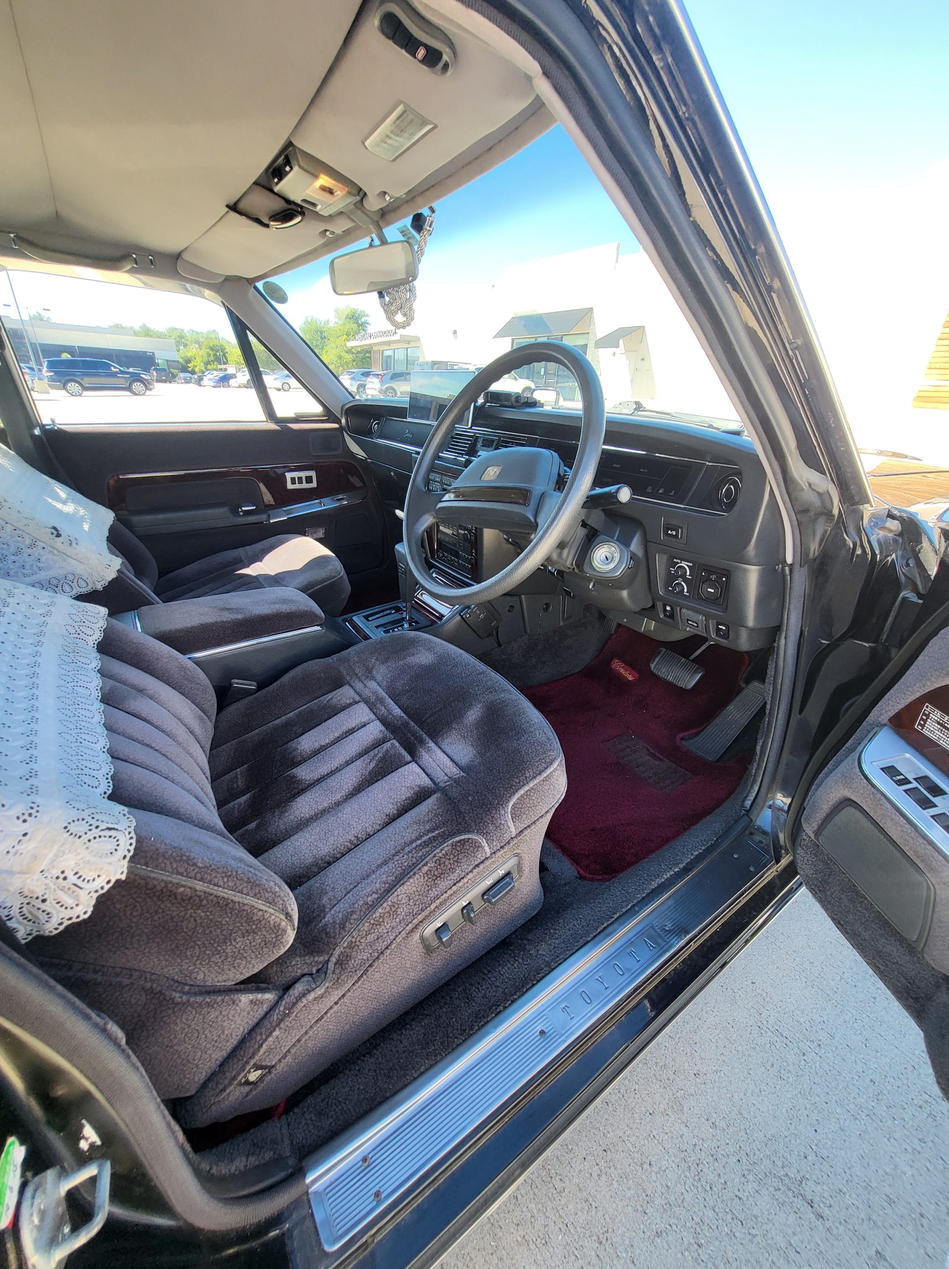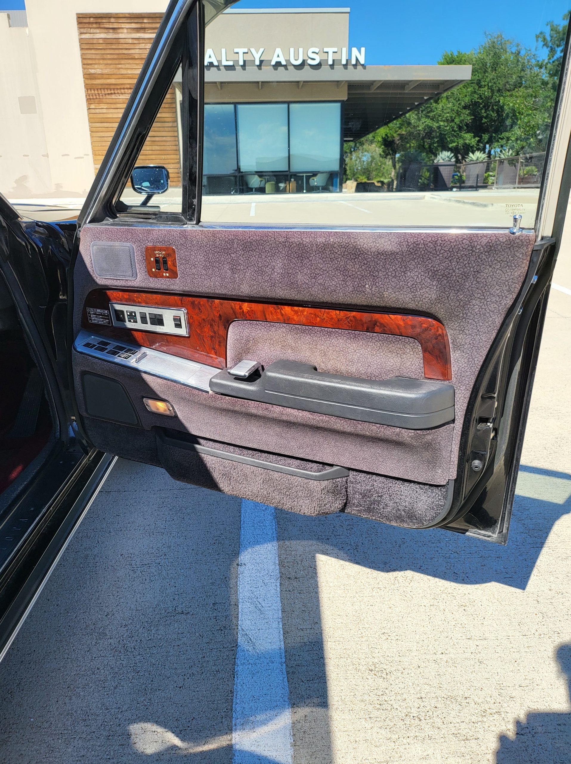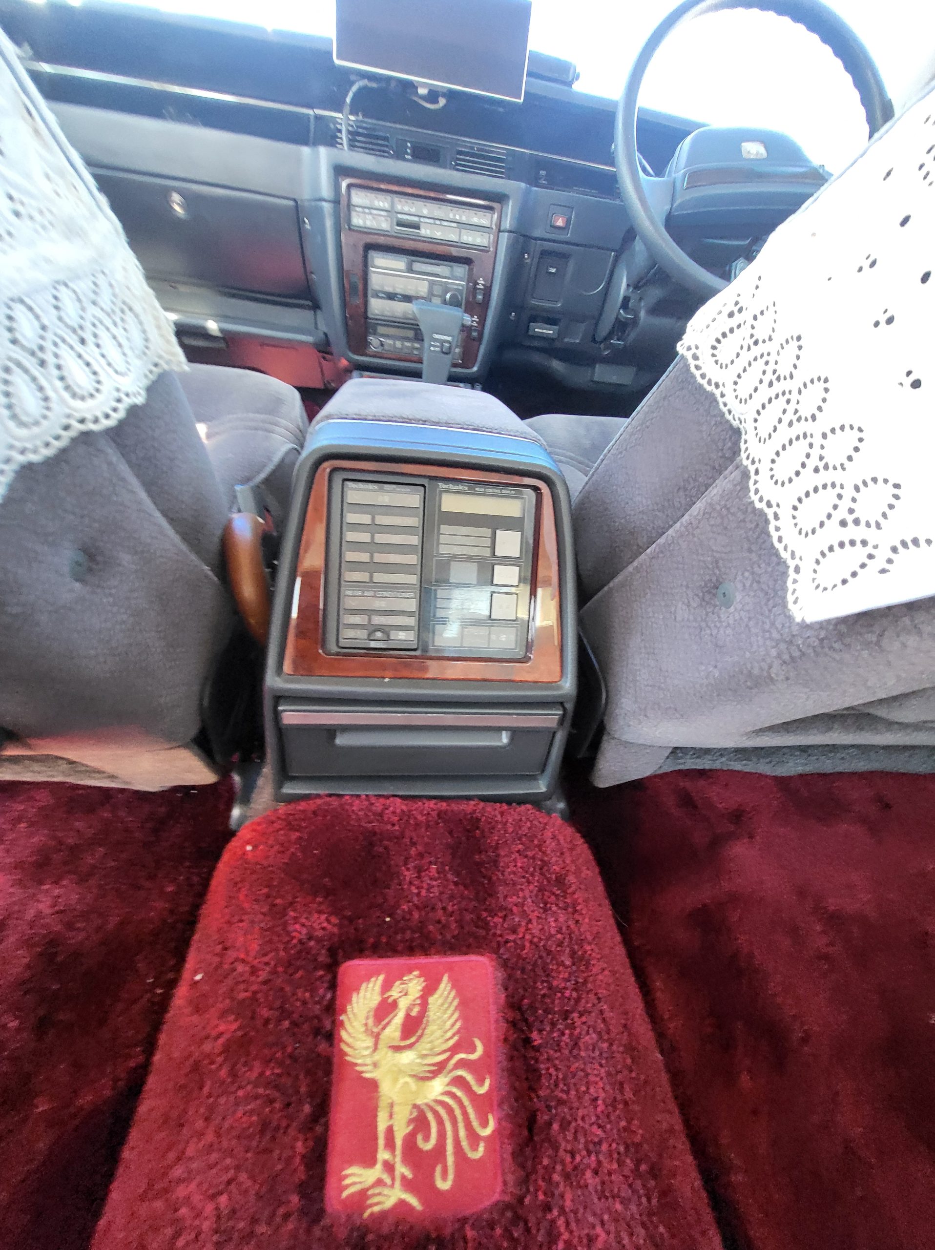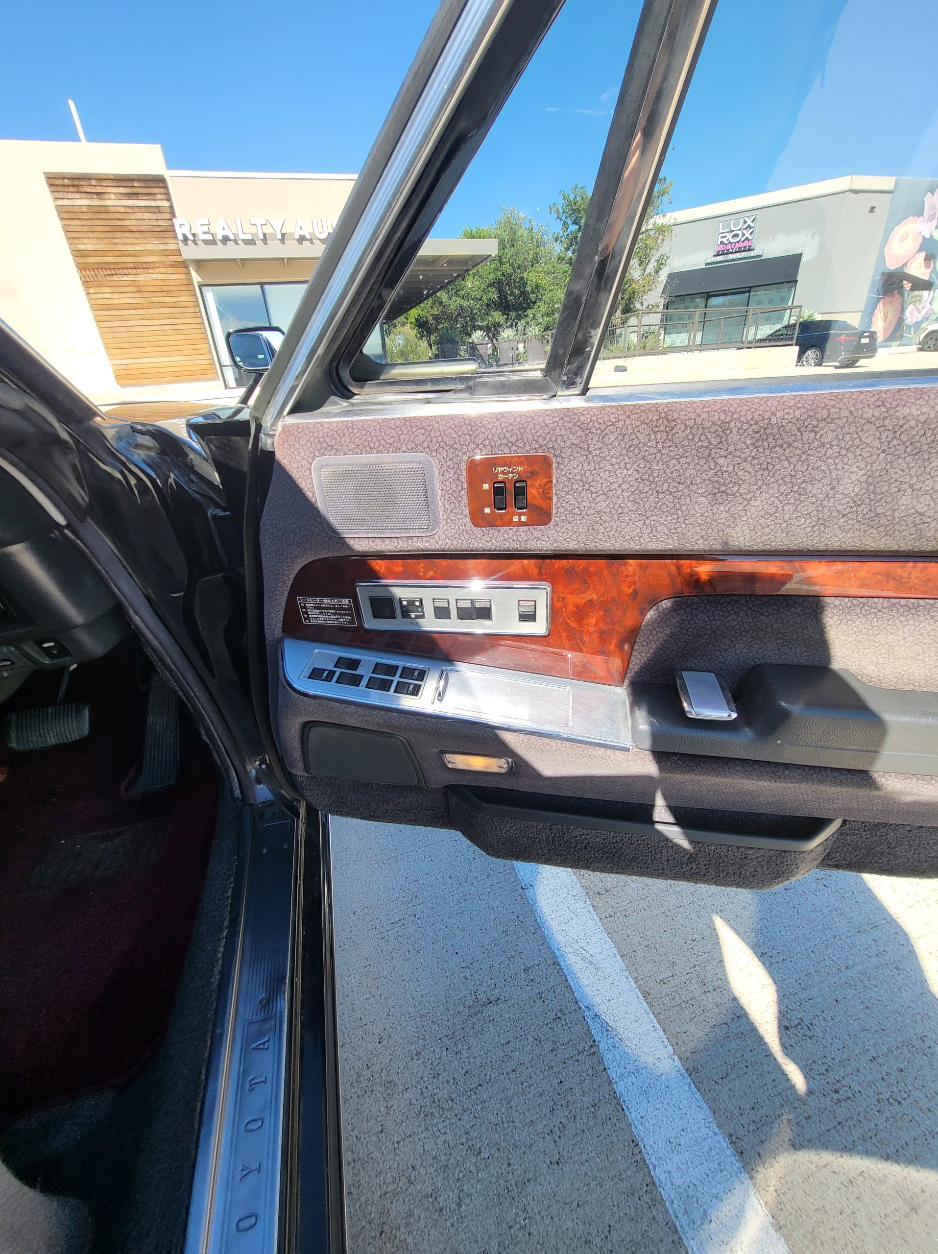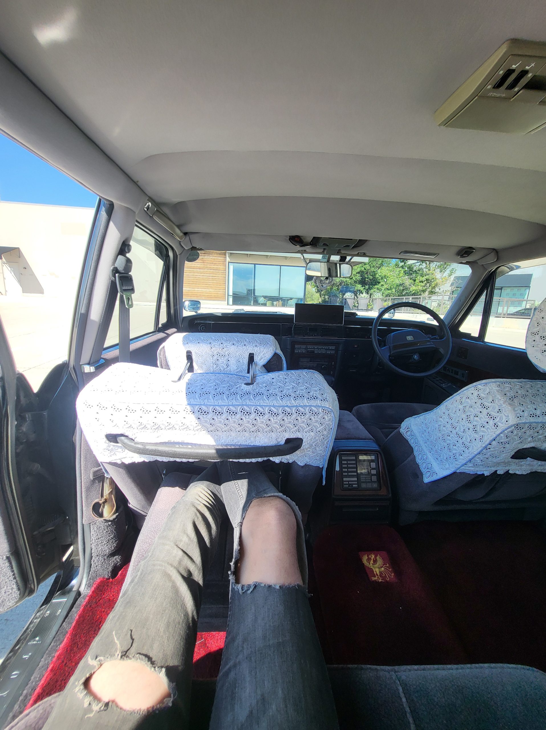 Had to buy 5 head units to find one where the tape deck still works. Didn’t want to ruin the vibe with a goofy looking aftermarket unit. The bottom slot under the radio is a (extremely rare) car phone unit; it doesn’t do anything but it looks cool. Every seat has it’s own cigarette lighter. All the wood trim that looks like plastic is actually solid blocks of milled burl wood (see the edge of the center pocket), Car is tinted all the way around including the windshiled with super light blue 99% UV blocking heat rejection film; I forget the brand but it was whatever the best one that they sold at the time (not cheap). Interior lace covers and curtains have been freshly dry cleaned. Including a few vintage japanese casettes in the arm rest. Also this shows the controls for the seat massagers, the seat heaters, and the controls for the rear passenger to move up the front seats if they choose. There are some cigarette burns on the driver A pillar from the previous owner, haven’t been able to source a replacement for that yet but I can help you do this. Gauge cluster works, basically everything works perfect. Couple cracks in the lower front kick panel. Head liner is mint. Floor mats are near mint, little bit of wear on the driver mat.