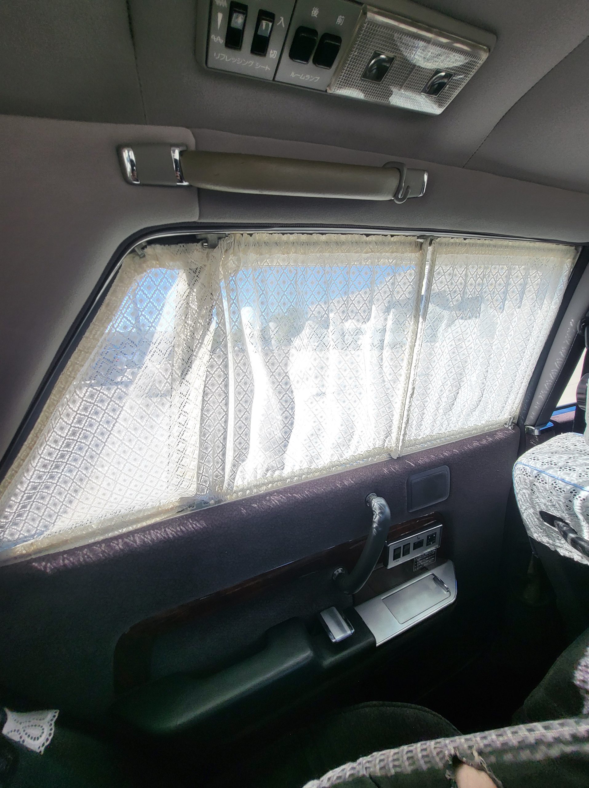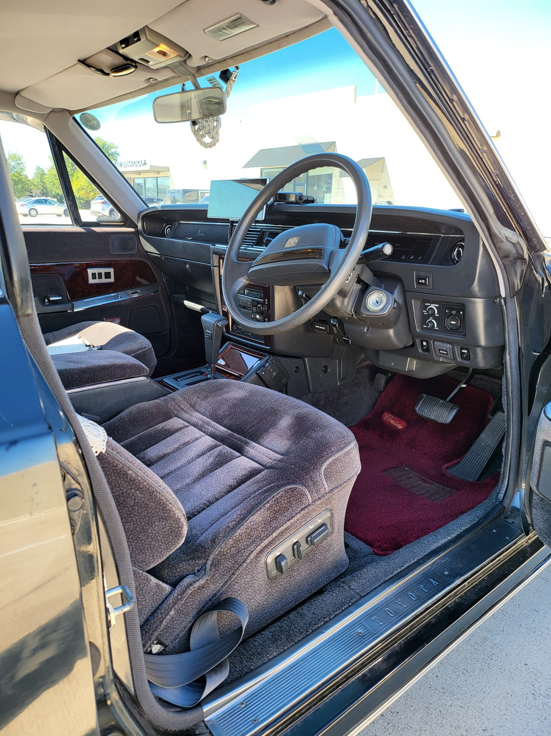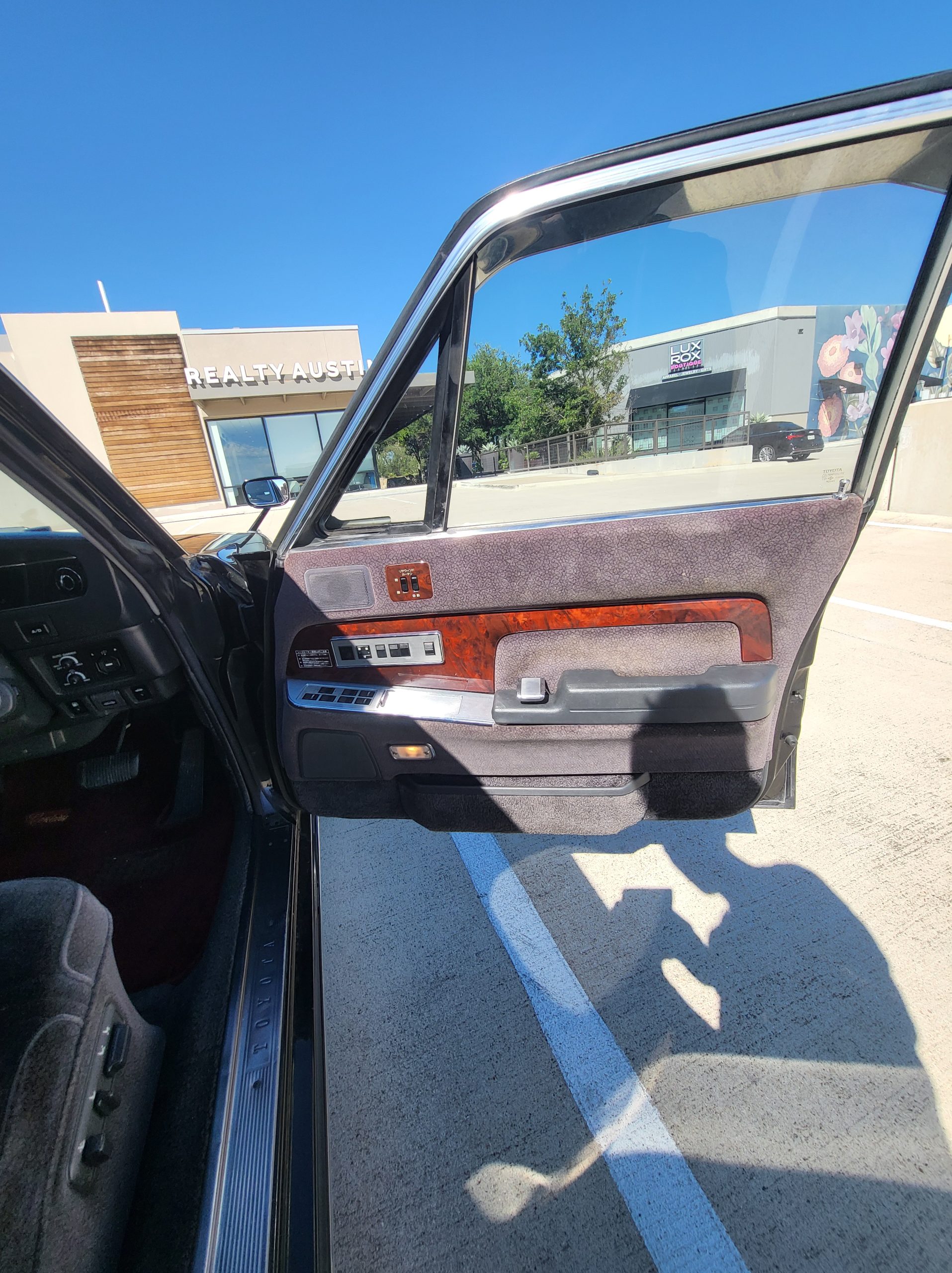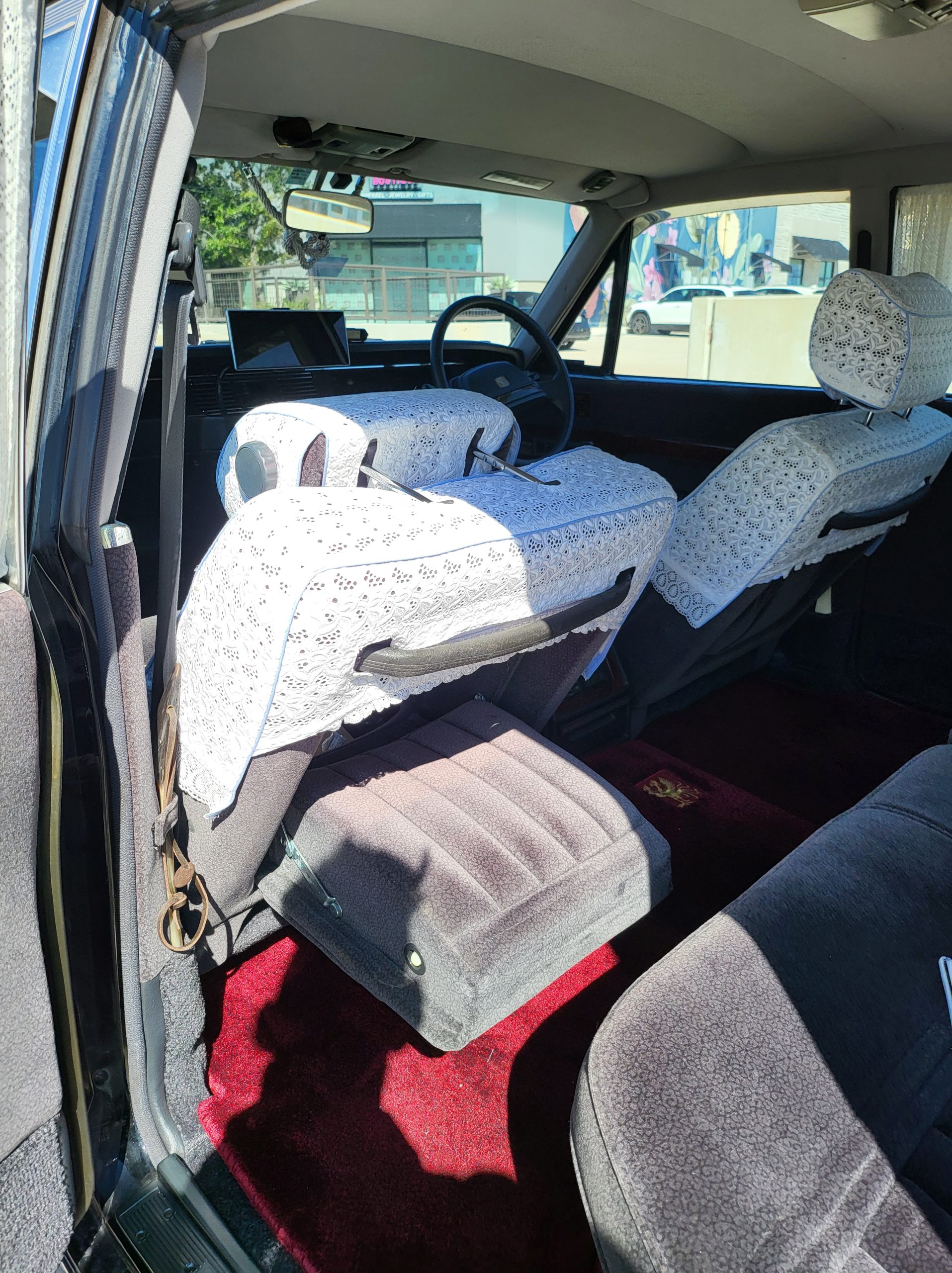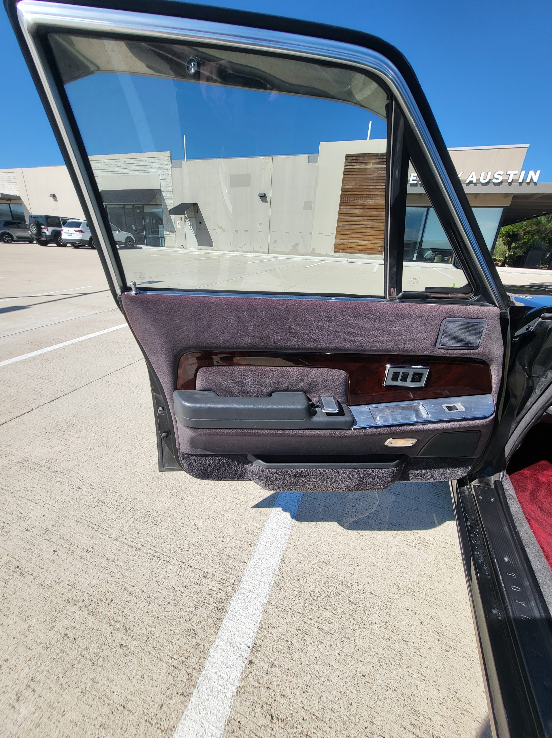 Had to buy 5 head units to find one where the tape deck still works. Didn’t want to ruin the vibe with a goofy looking aftermarket unit. The bottom slot under the radio is a (extremely rare) car phone unit; it doesn’t do anything but it looks cool. Every seat has it’s own cigarette lighter. All the wood trim that looks like plastic is actually solid blocks of milled burl wood (see the edge of the center pocket), Car is tinted all the way around including the windshiled with super light blue 99% UV blocking heat rejection film; I forget the brand but it was whatever the best one that they sold at the time (not cheap). Interior lace covers and curtains have been freshly dry cleaned. Including a few vintage japanese casettes in the arm rest. Also this shows the controls for the seat massagers, the seat heaters, and the controls for the rear passenger to move up the front seats if they choose. There are some cigarette burns on the driver A pillar from the previous owner, haven’t been able to source a replacement for that yet but I can help you do this. Gauge cluster works, basically everything works perfect. Couple cracks in the lower front kick panel. Head liner is mint. Floor mats are near mint, little bit of wear on the driver mat.