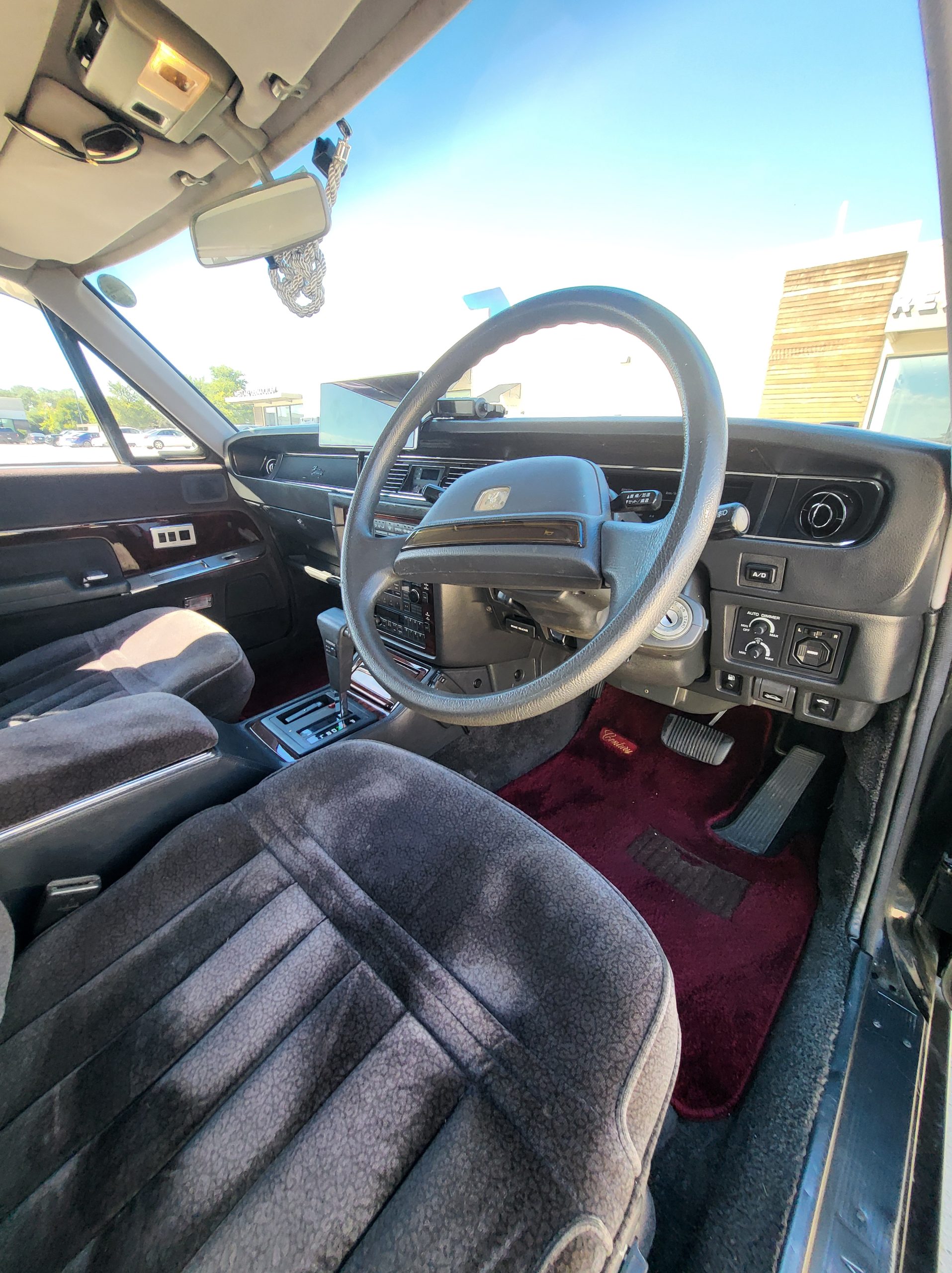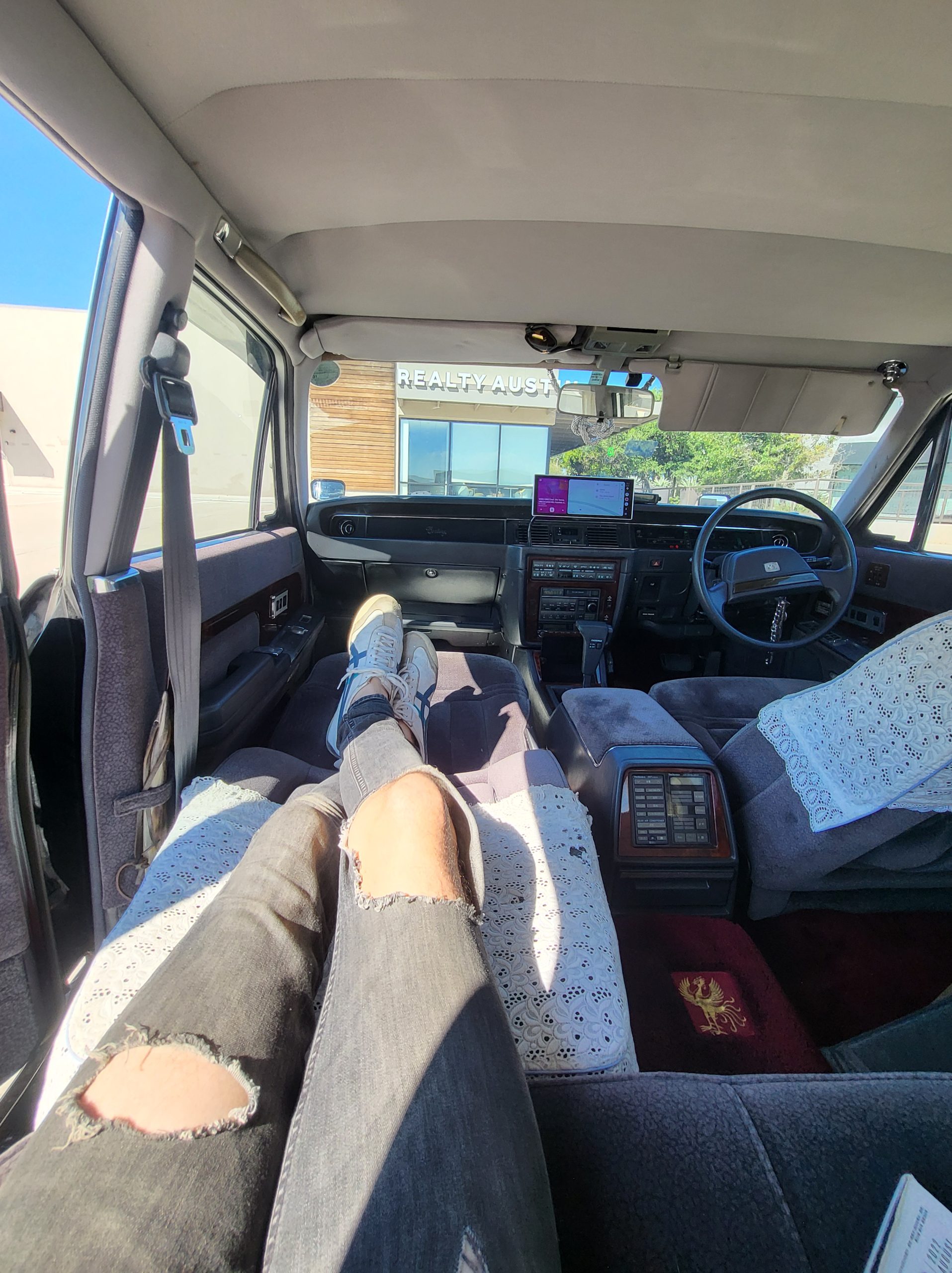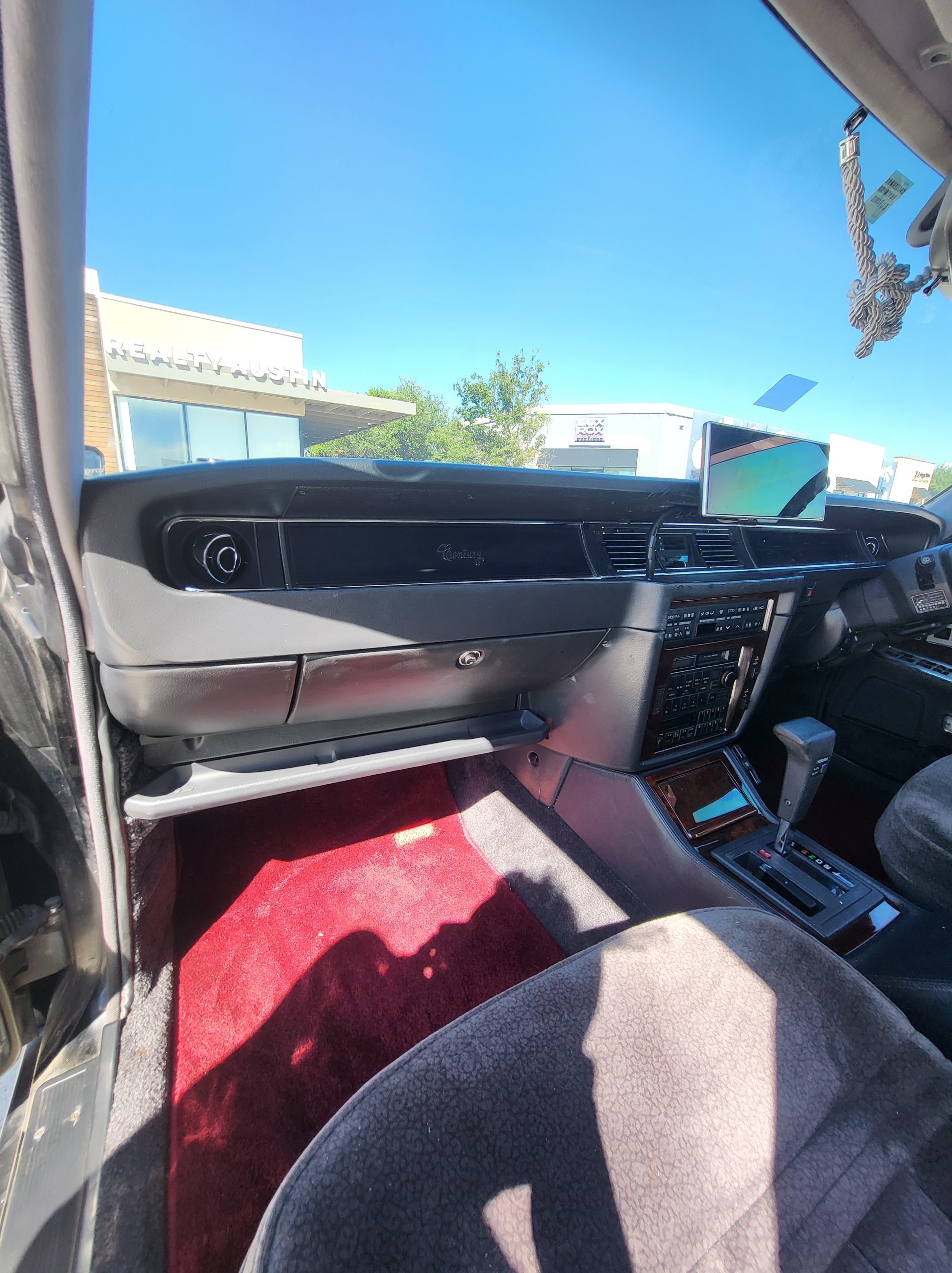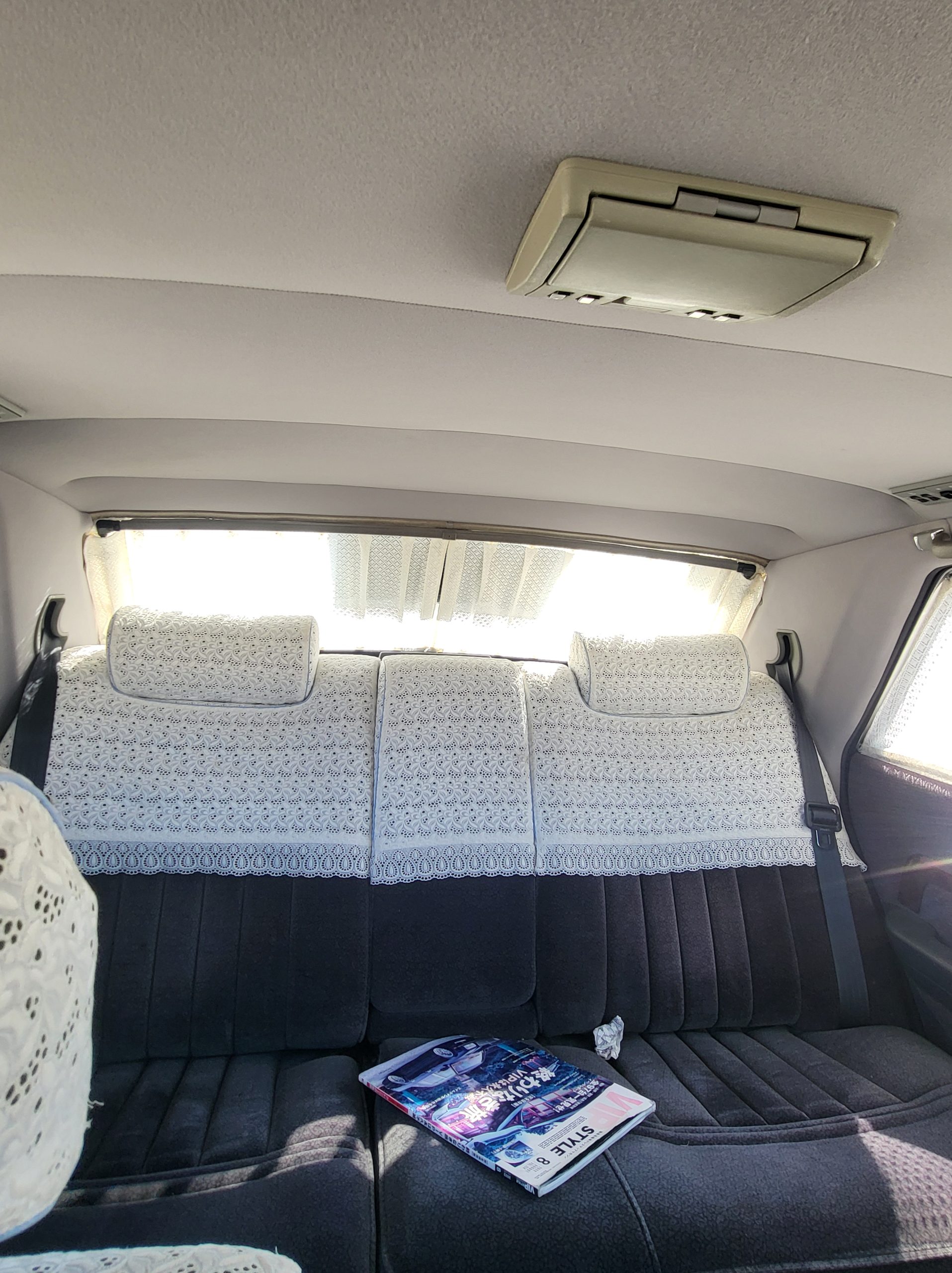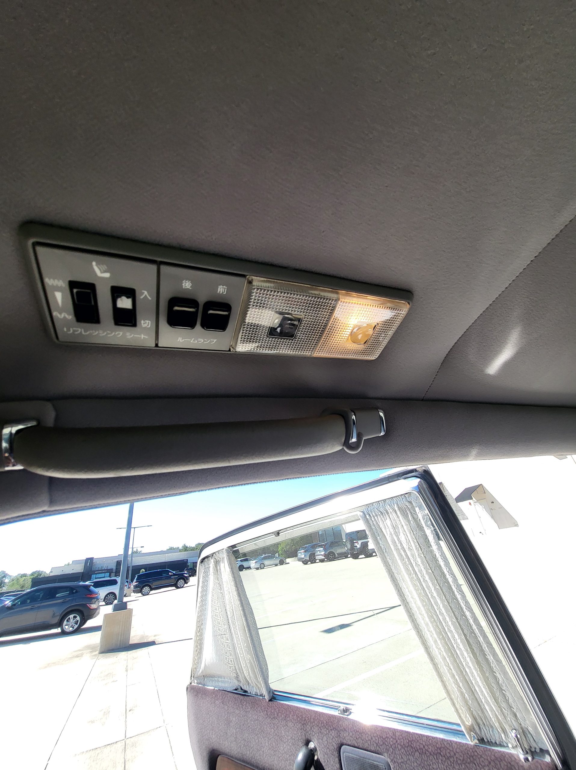Had to buy 5 head units to find one where the tape deck still works. Didn’t want to ruin the vibe with a goofy looking aftermarket unit. The bottom slot under the radio is a (extremely rare) car phone unit; it doesn’t do anything but it looks cool. Every seat has it’s own cigarette lighter. All the wood trim that looks like plastic is actually solid blocks of milled burl wood (see the edge of the center pocket), Car is tinted all the way around including the windshiled with super light blue 99% UV blocking heat rejection film; I forget the brand but it was whatever the best one that they sold at the time (not cheap). Interior lace covers and curtains have been freshly dry cleaned. Including a few vintage japanese casettes in the arm rest. Also this shows the controls for the seat massagers, the seat heaters, and the controls for the rear passenger to move up the front seats if they choose. There are some cigarette burns on the driver A pillar from the previous owner, haven’t been able to source a replacement for that yet but I can help you do this. Gauge cluster works, basically everything works perfect. Couple cracks in the lower front kick panel. Head liner is mint. Floor mats are near mint, little bit of wear on the driver mat.