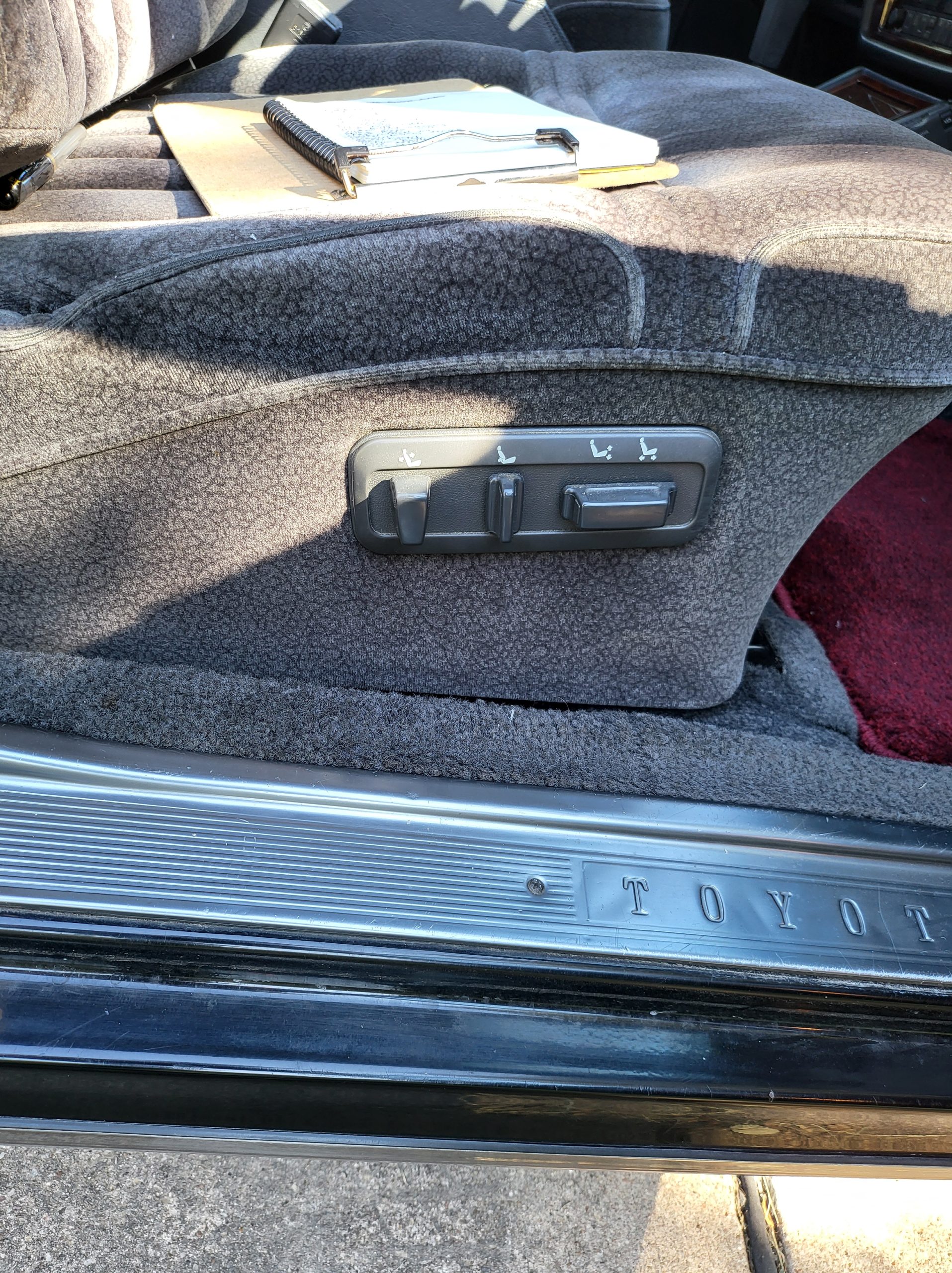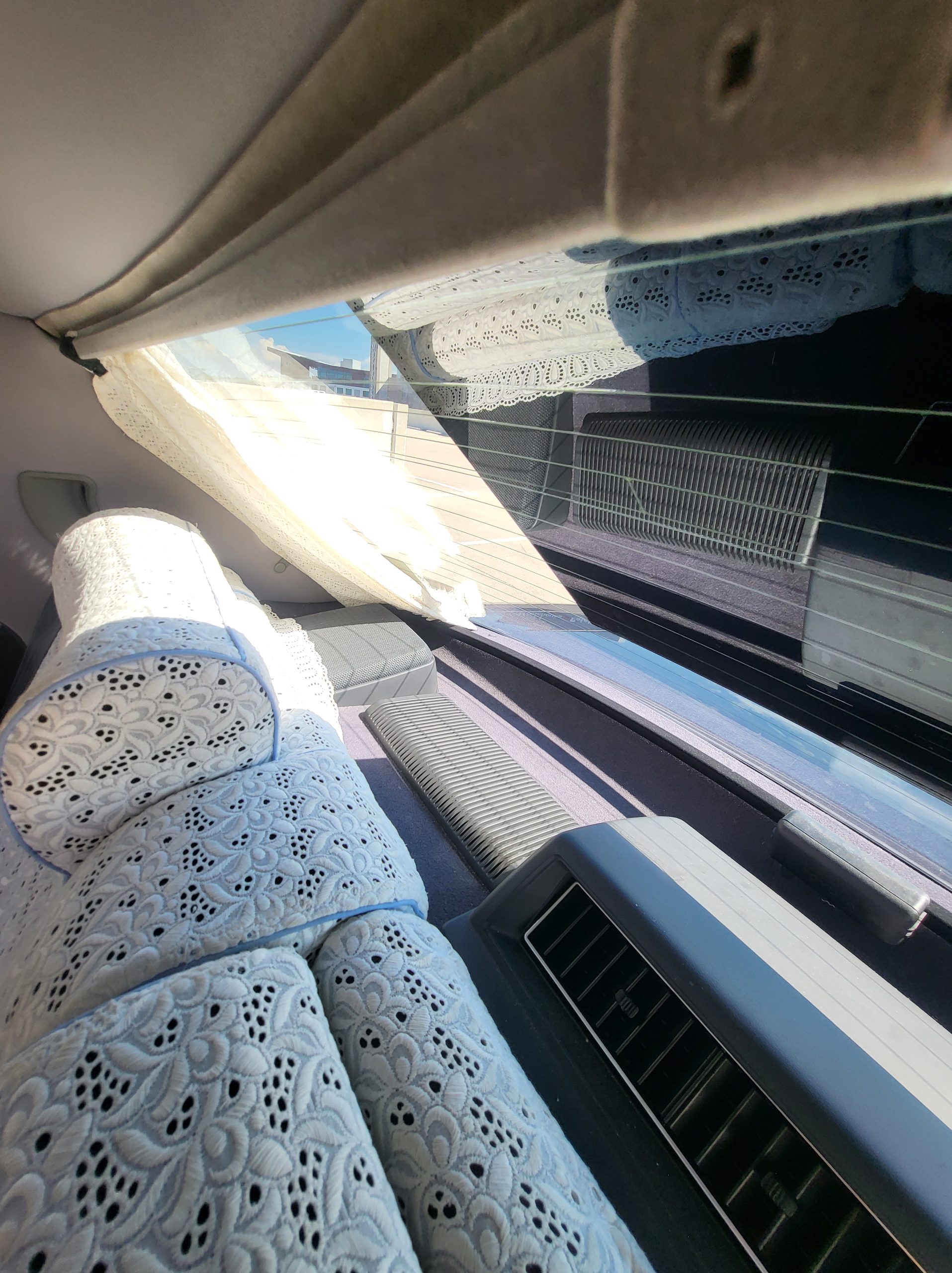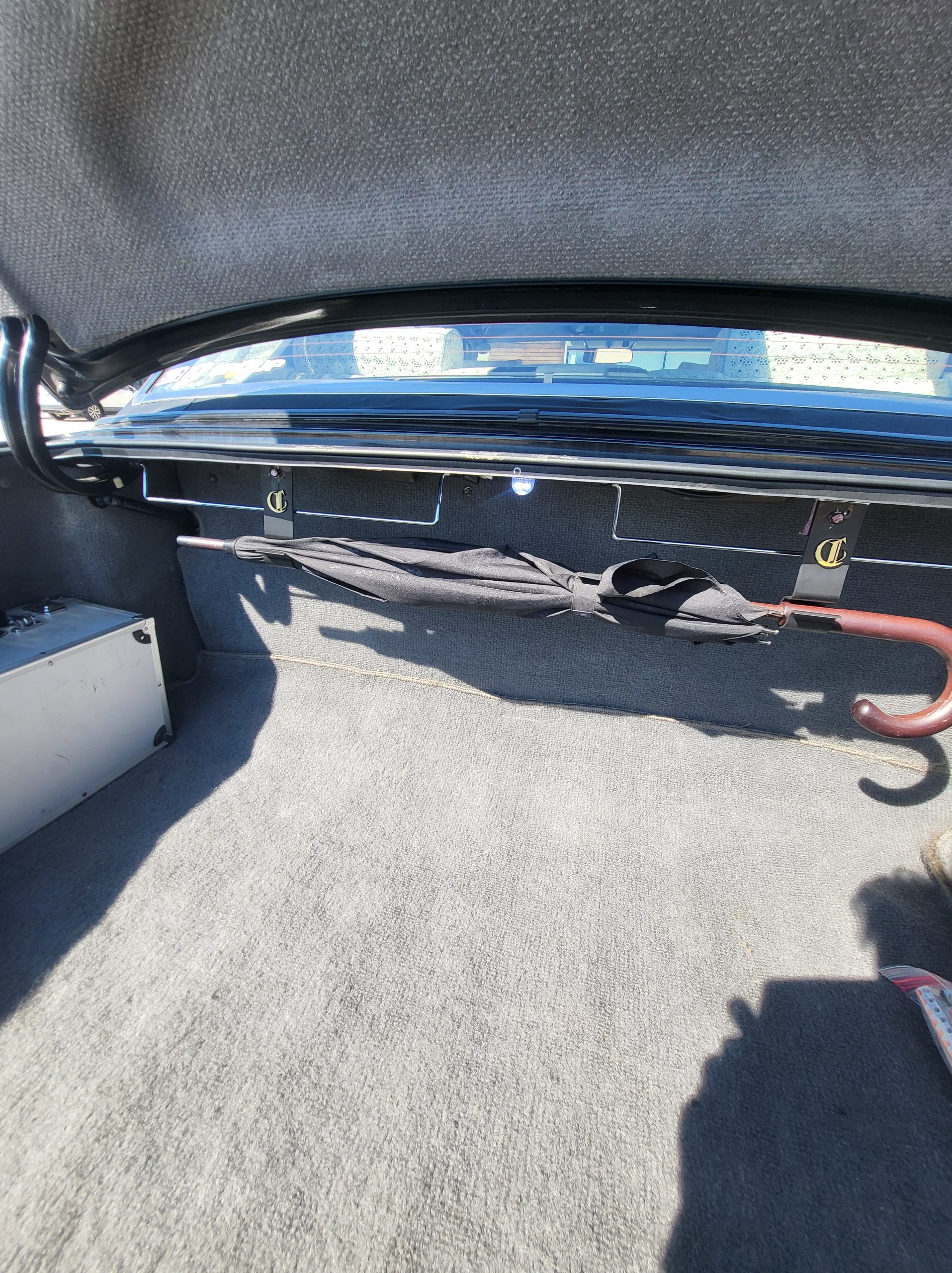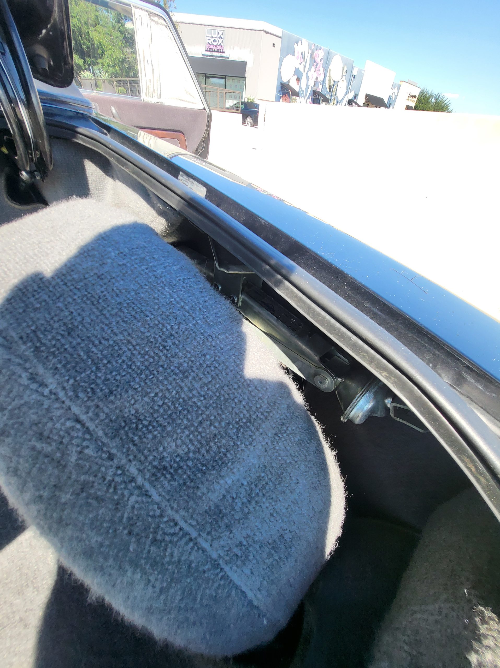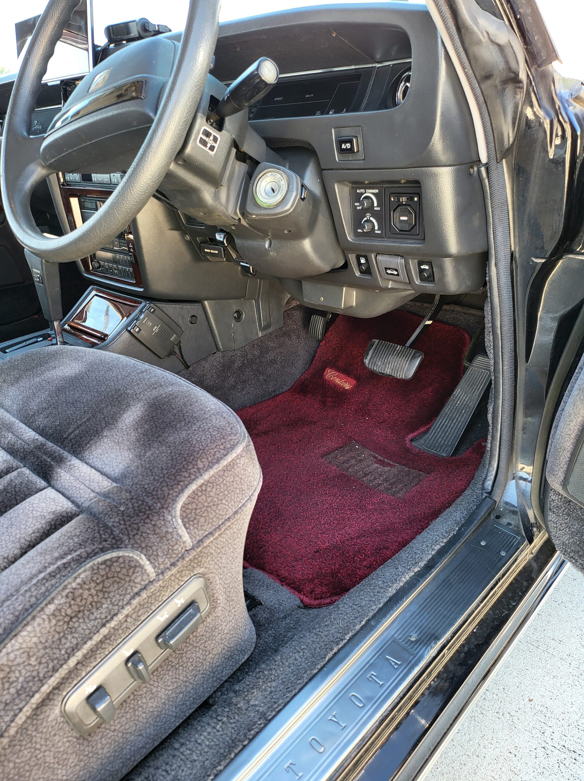 Had to buy 5 head units to find one where the tape deck still works. Didn’t want to ruin the vibe with a goofy looking aftermarket unit. The bottom slot under the radio is a (extremely rare) car phone unit; it doesn’t do anything but it looks cool. Every seat has it’s own cigarette lighter. All the wood trim that looks like plastic is actually solid blocks of milled burl wood (see the edge of the center pocket), Car is tinted all the way around including the windshiled with super light blue 99% UV blocking heat rejection film; I forget the brand but it was whatever the best one that they sold at the time (not cheap). Interior lace covers and curtains have been freshly dry cleaned. Including a few vintage japanese casettes in the arm rest. Also this shows the controls for the seat massagers, the seat heaters, and the controls for the rear passenger to move up the front seats if they choose. There are some cigarette burns on the driver A pillar from the previous owner, haven’t been able to source a replacement for that yet but I can help you do this. Gauge cluster works, basically everything works perfect. Couple cracks in the lower front kick panel. Head liner is mint. Floor mats are near mint, little bit of wear on the driver mat.