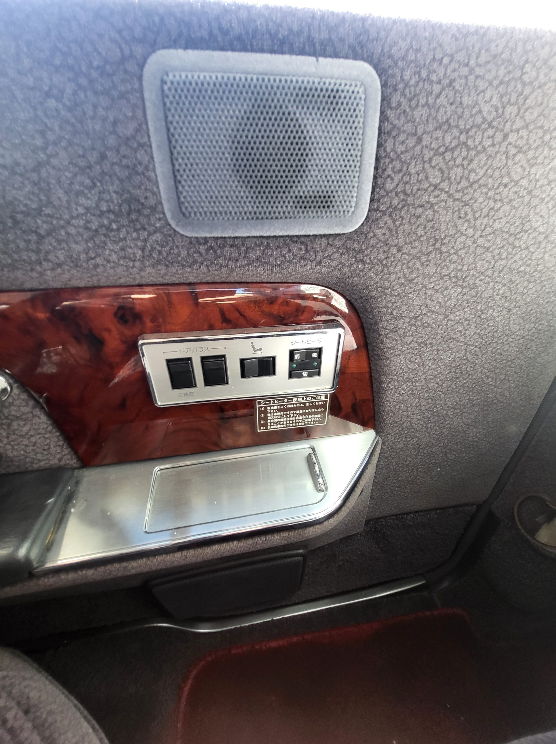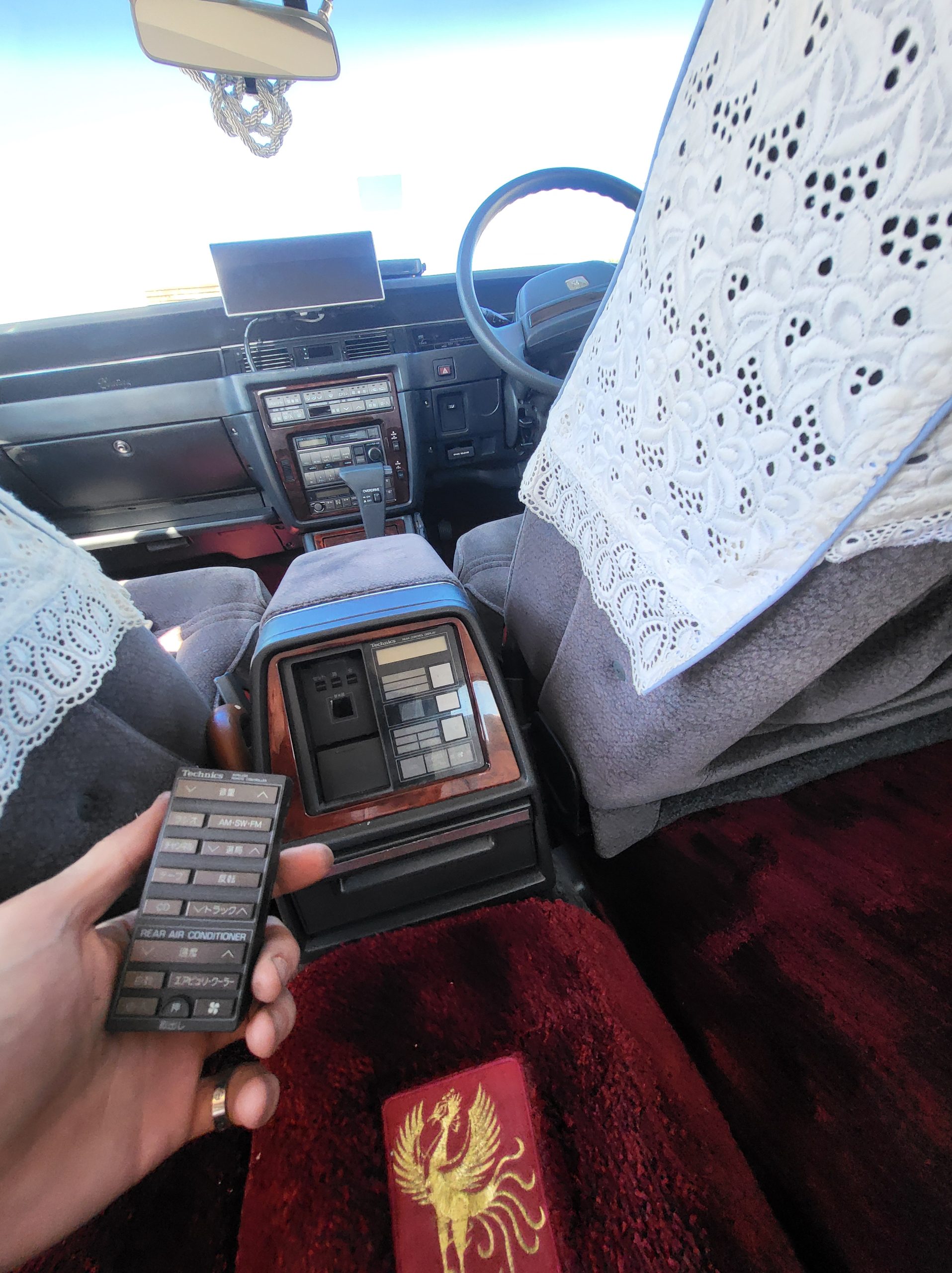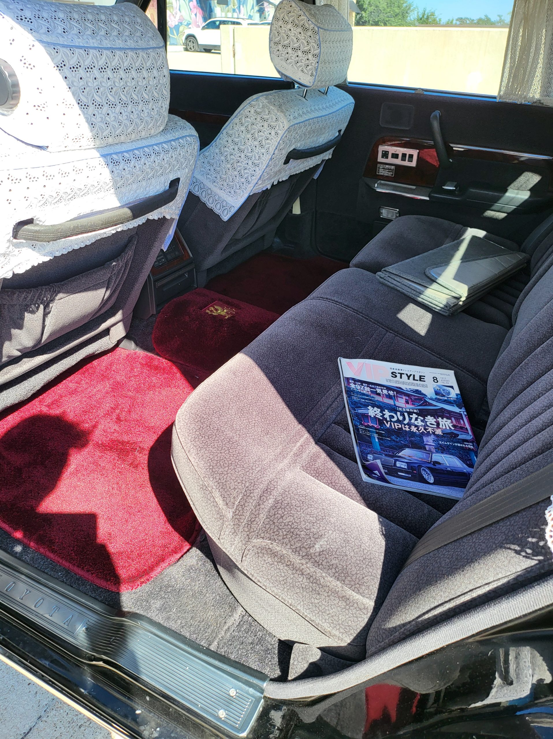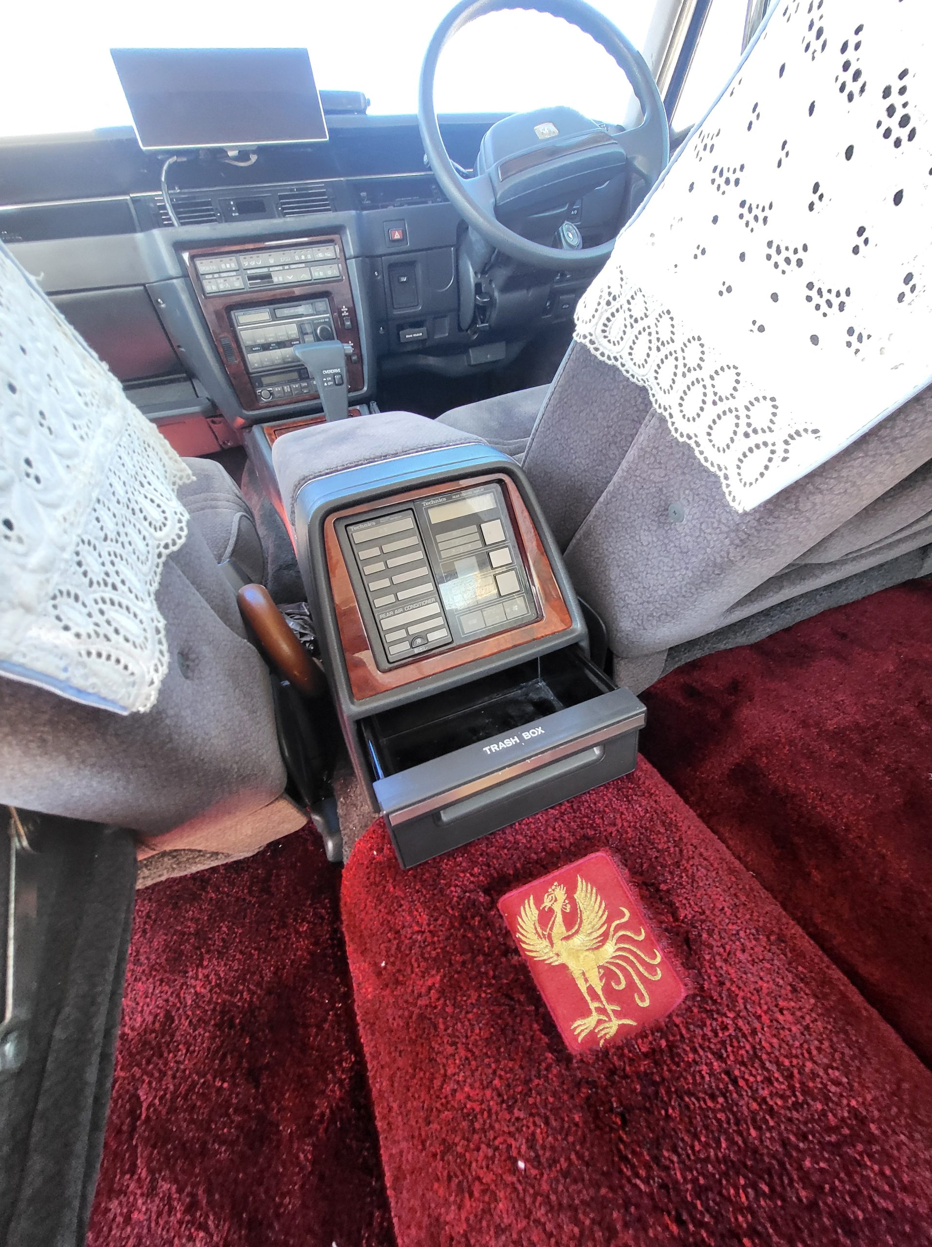 This section tries to highlight some of the more unique features. I’ll explain further as time allows. Rear seat dictaphone, pass-through lounge chair rear seat, rear radio remote control, shoe horn holders, power operated rear curtains, charcoal cigarette filter, champagne box, dual rear subwoofers, illuminated parking pole, heads up display spedometer, lay-flat power seats, power rear seats, seat massagers, Tokyo expressway tollway card reader (speaks to you in japanese), easy access battery charger hookup, trunk umbrella holder, flip down grocery bag racks, YAMATO vanity plate, Factory OEM ostrich feather duster, full size spare tire, stainless rain visors, OEM curtains and upholstery lace covers, 100% virgin wool upholstery from scotland imported to kyoto (the cheaper spec is leather)
