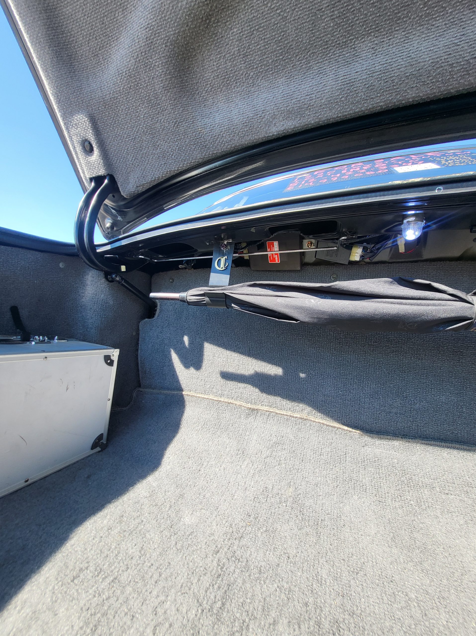trunk shocks have been replace / trunk easily opens by itself. Power opener button by the driver position. Also trunk is soft close actuated. Umbrella holder, grocery bag holders, full size spare, feather duster, storage bag etc.
