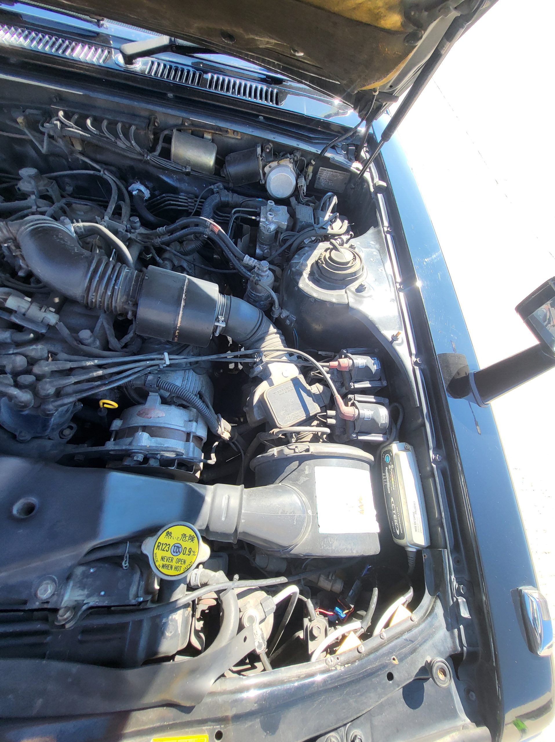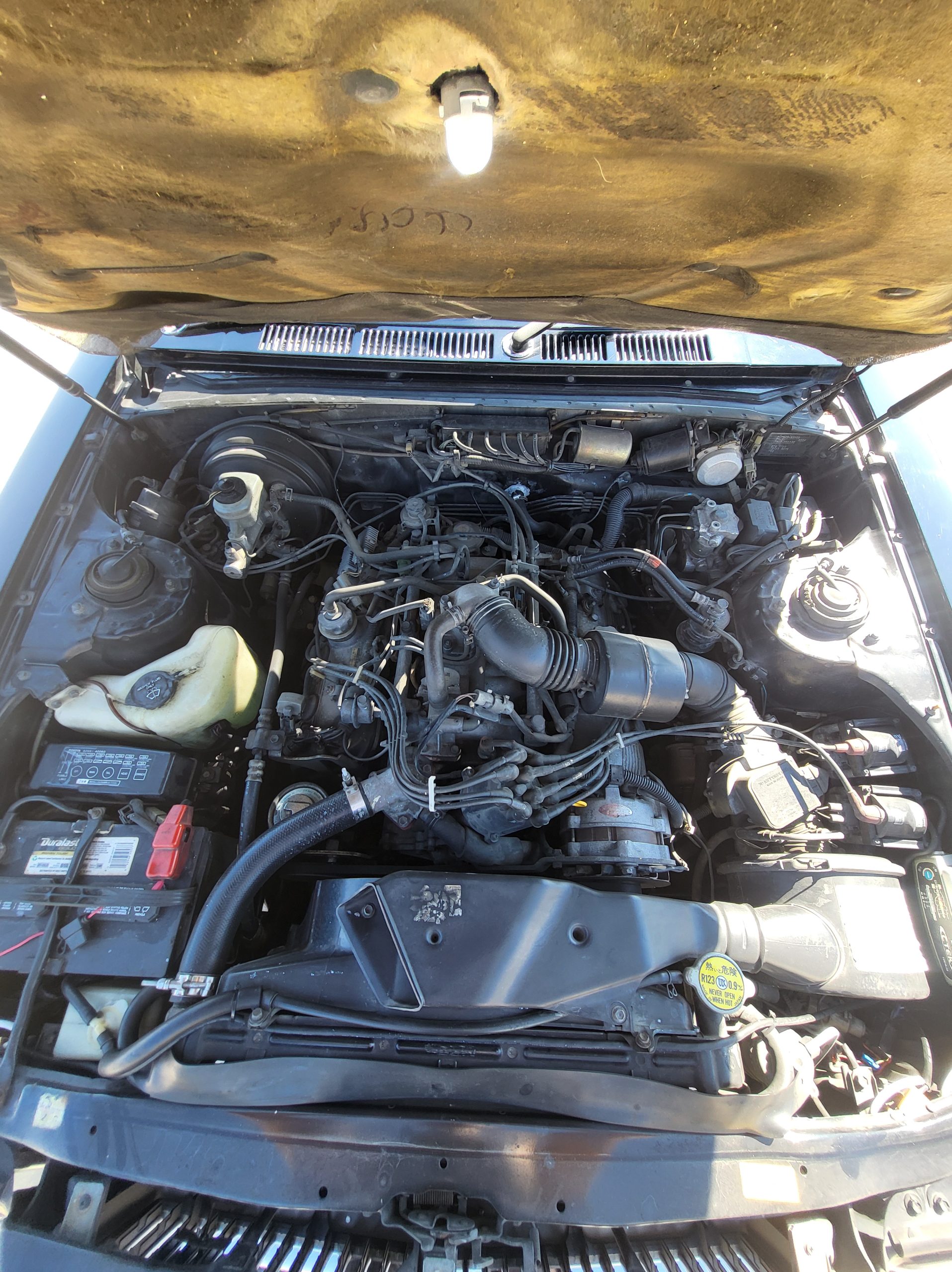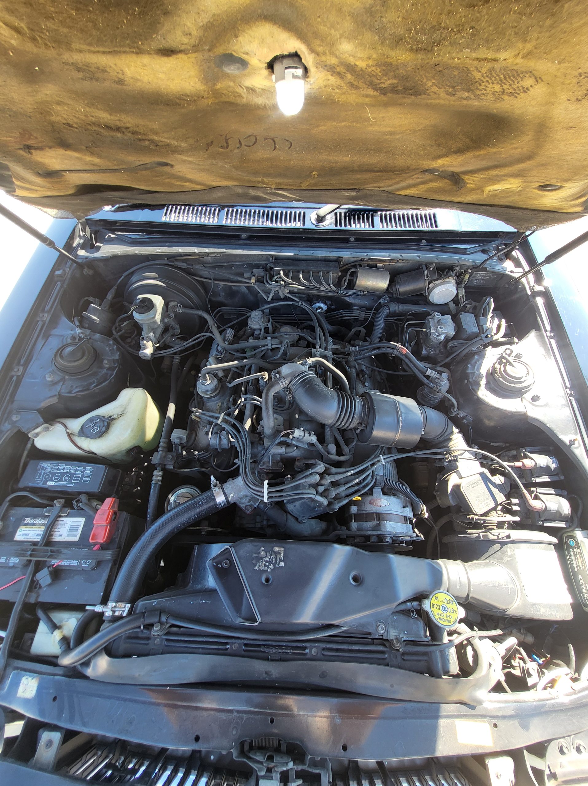 Engine bay is in wonderful shape (note the integrated lamp in the center) Also note the integrated CTEK trickle charger hard mounted to the battery for easy charging if you don’t drive it for a while. Also the car has a new thermostat and new radiator hoses and I put t-bolt clamps instead of the worm gears, also the alternator is new. Also I service the AC maybe around 2 years ago and changed the coolant out and all that, blows like ice. Also if you see the wires up by the headlights, that look aftermarket, that’s load resistors for the LED turn signals.